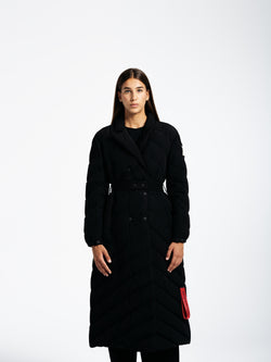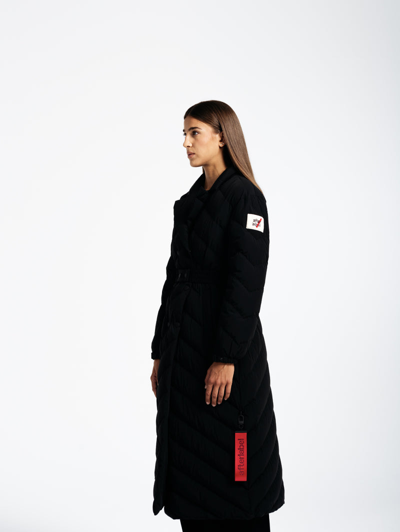 Piumino lungo con allacciatura doppiopetto e cintura in vita in nylon opaco Zagabria da donna di After Label.