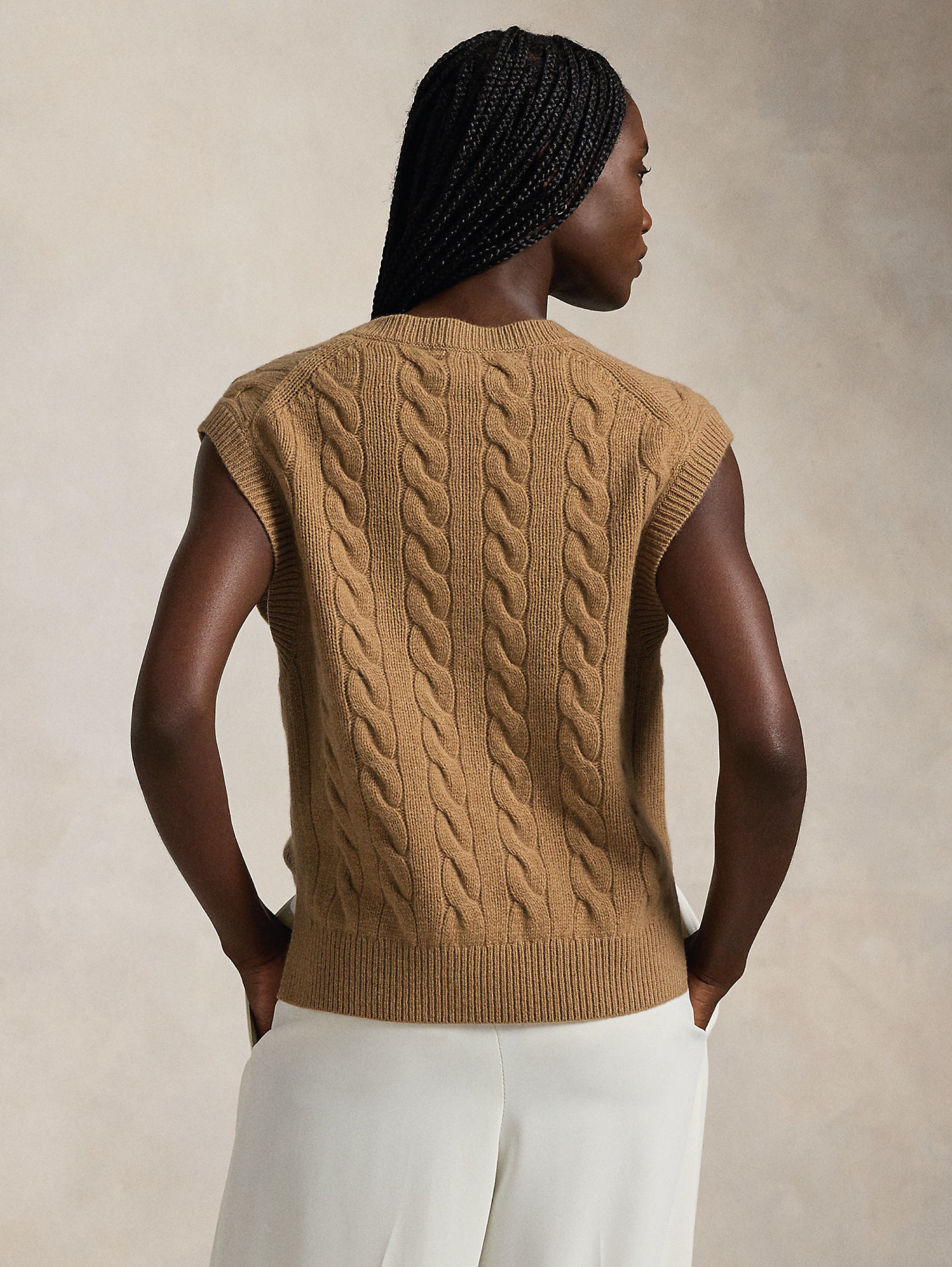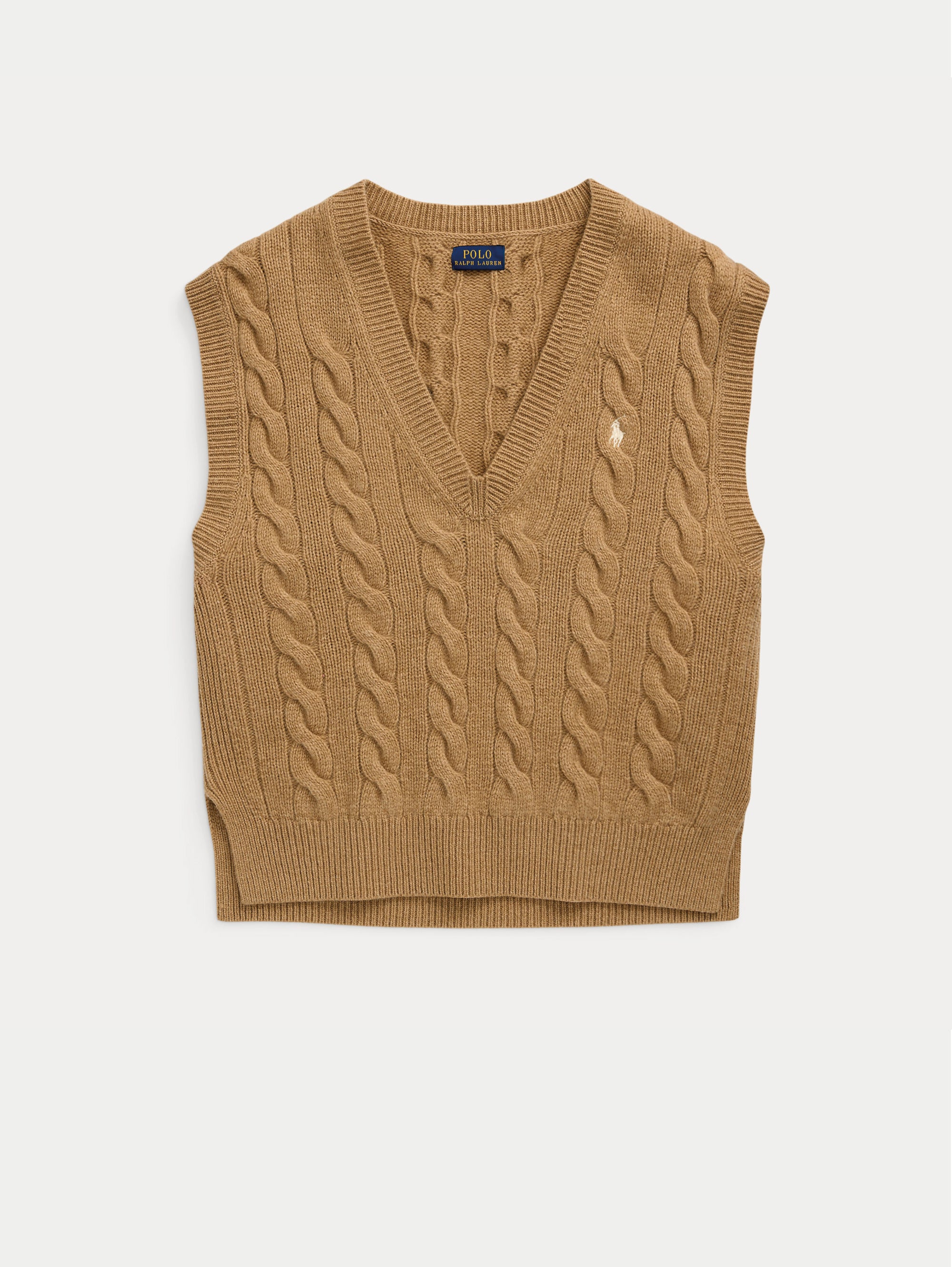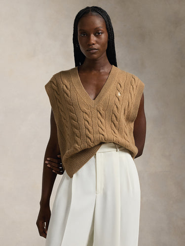 Realizzato con un misto di spessa lana italiana e morbido cashmere, questo gilet in maglia coniuga la nostra iconica lavorazione a trecce con finiture a coste e l'esclusivo pony ricamato.
