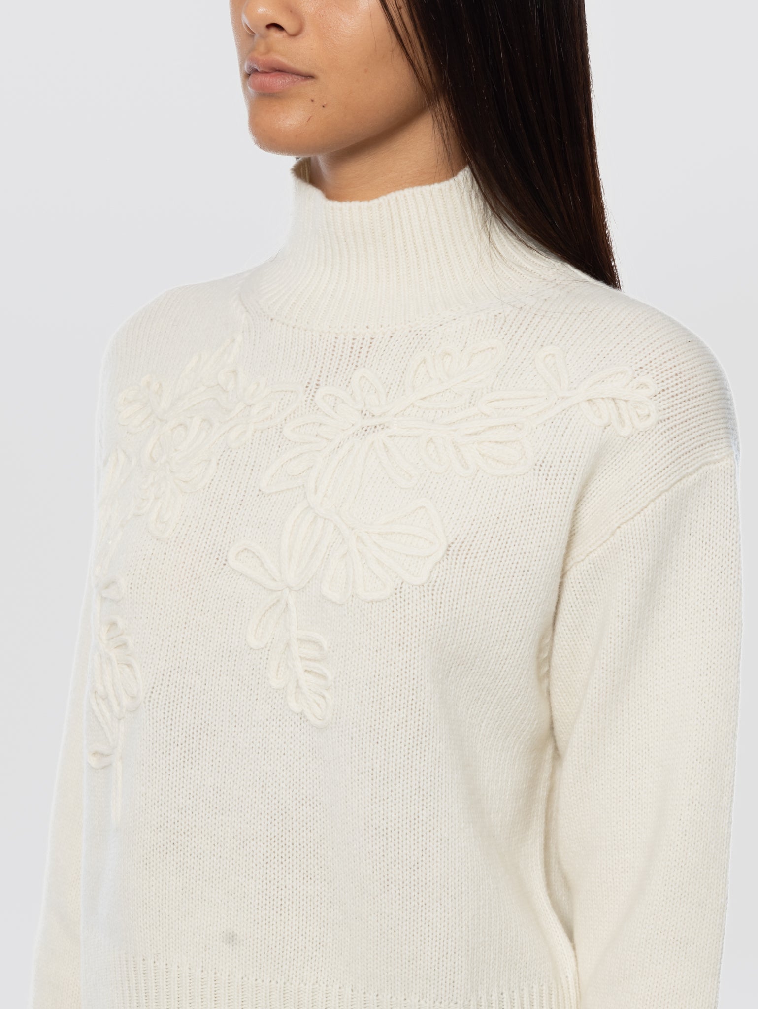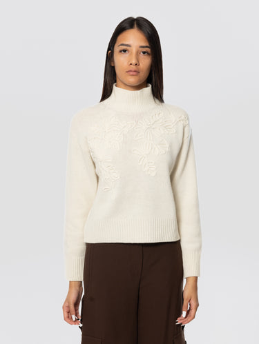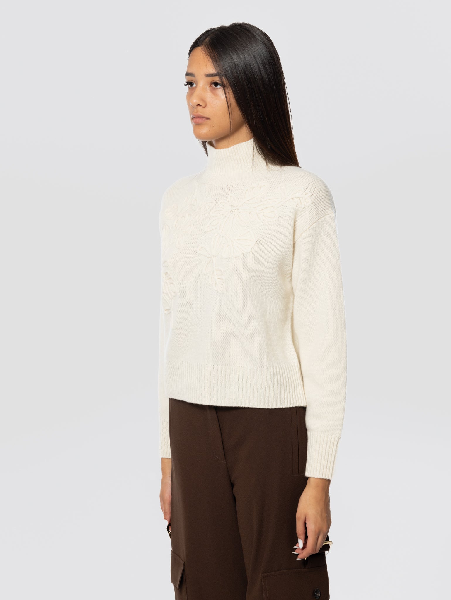 Maglione Collo Alto con Ricami in Lana Ecrù