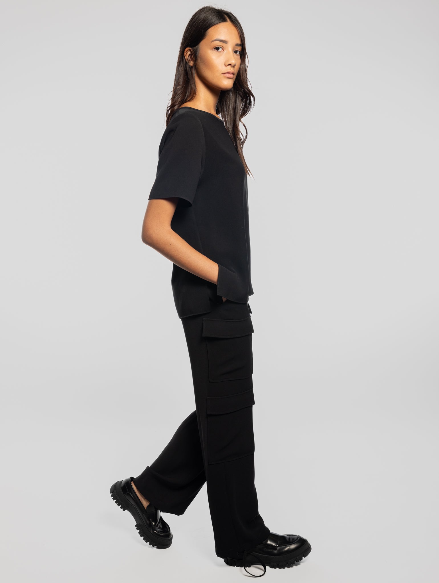 - Di ispirazione militare ma in un tessuto micro-crepe tecnico elegante