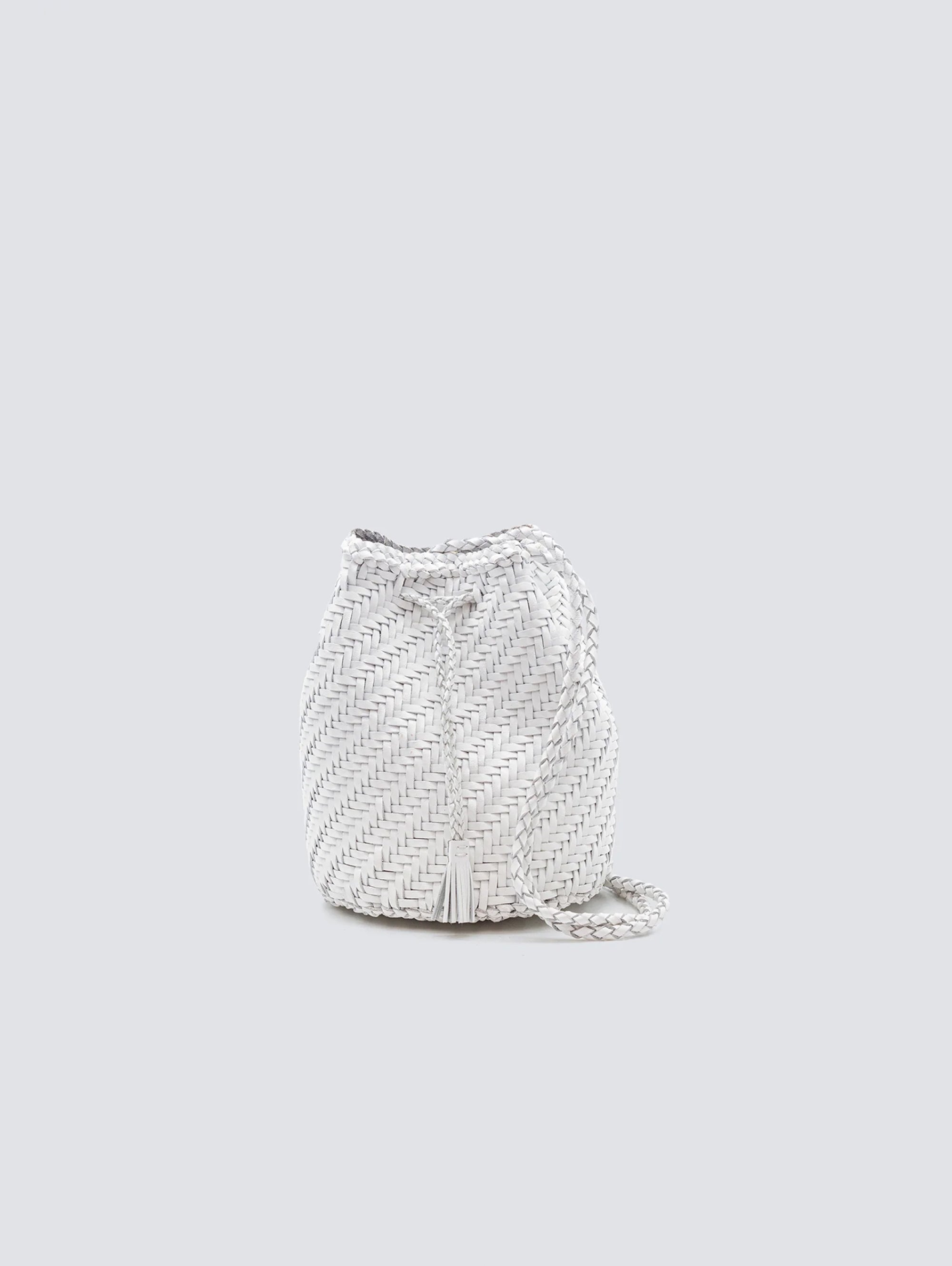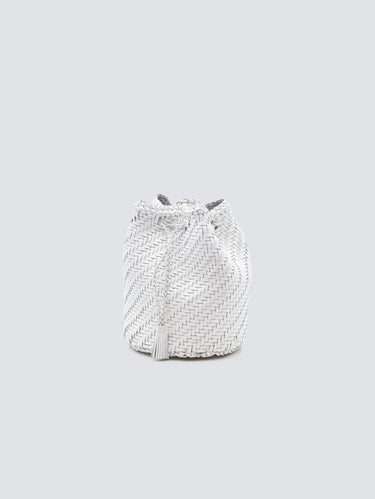 Borsa a secchiello piccola a tracolla in pelle intrecciata PomPom Double Jump da donna di Dragon Diffusion.
