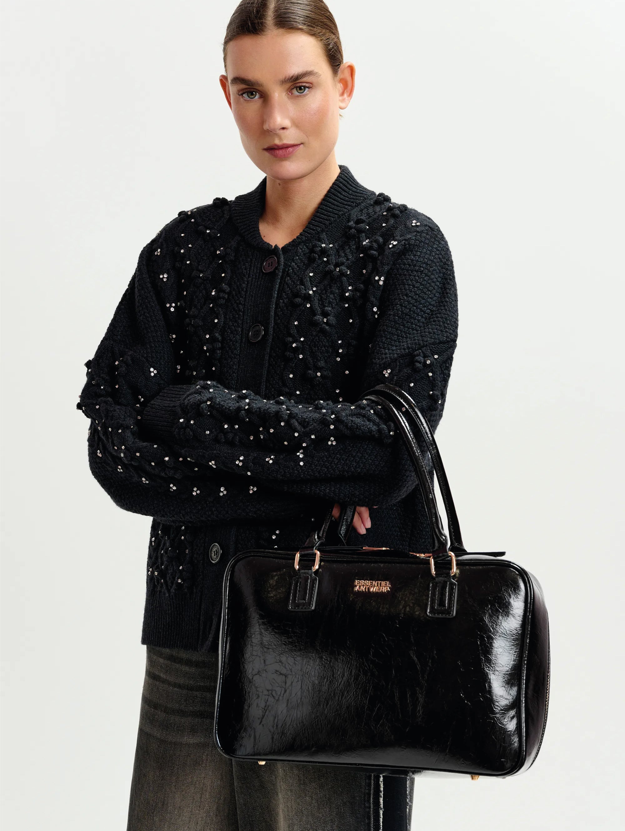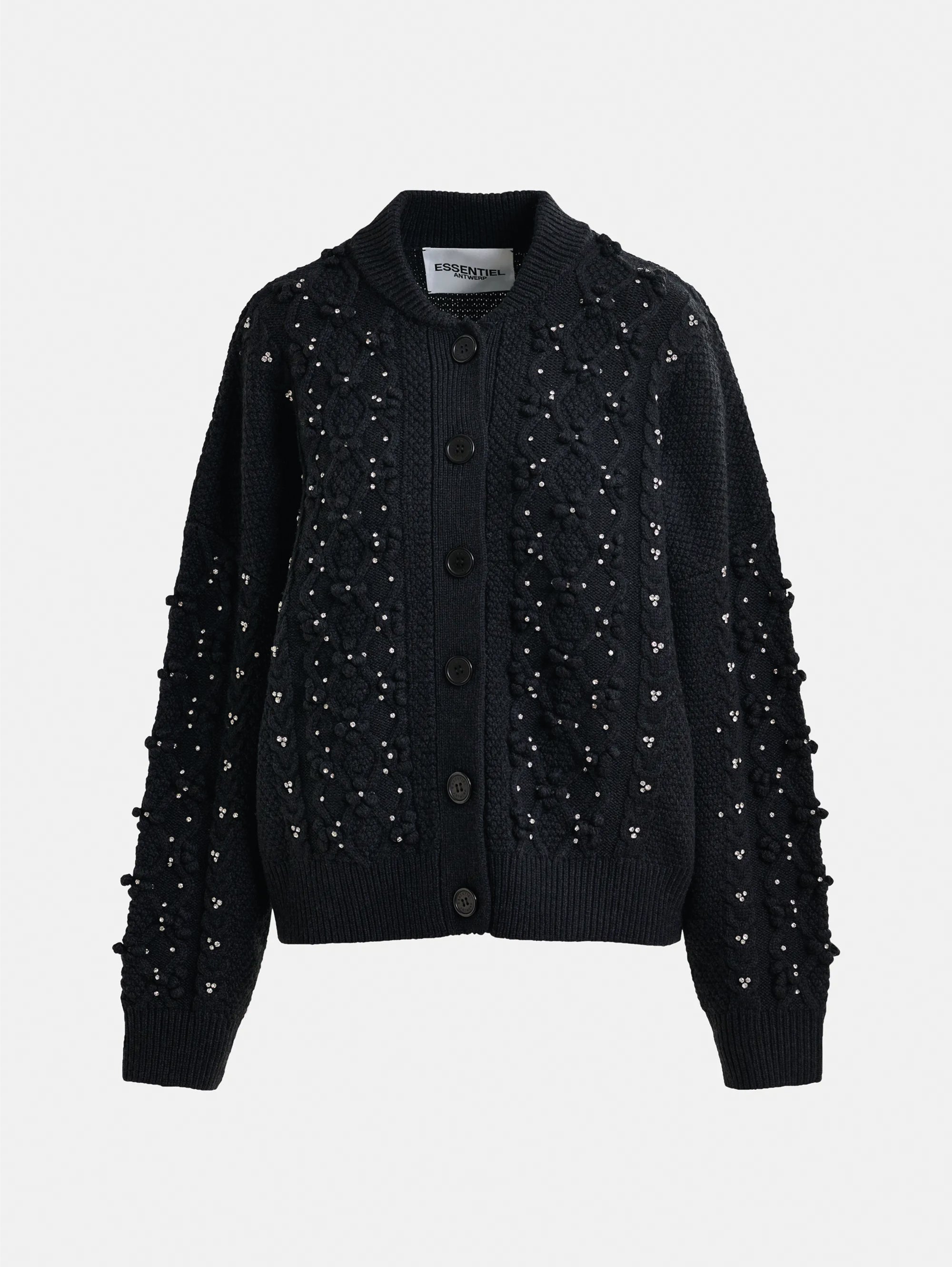 Cardigan in misto lana a trecce con applicazioni floreali tono su tono e strass in vetro modello Iltimate da donna di Essentiel Antwerp.