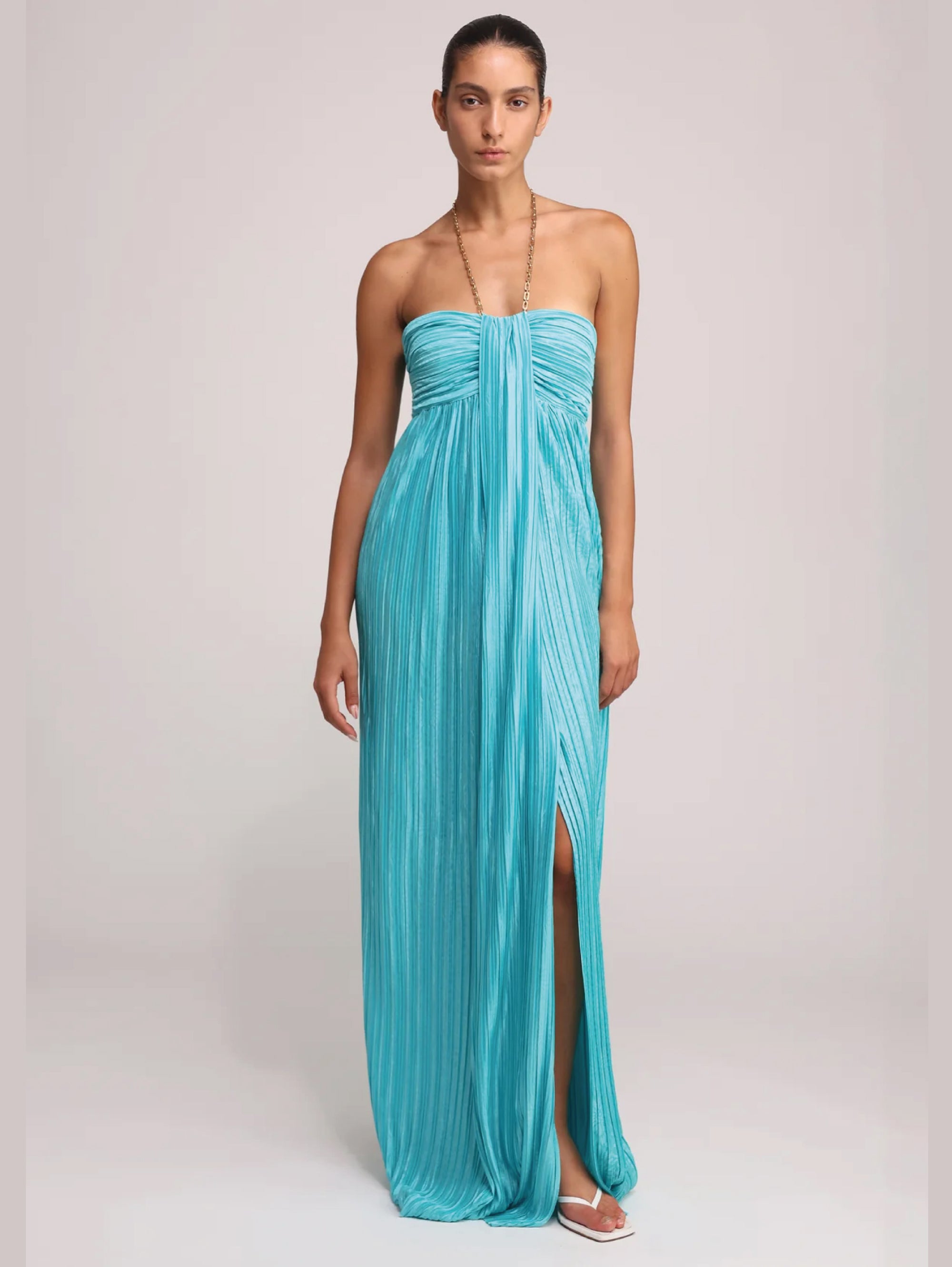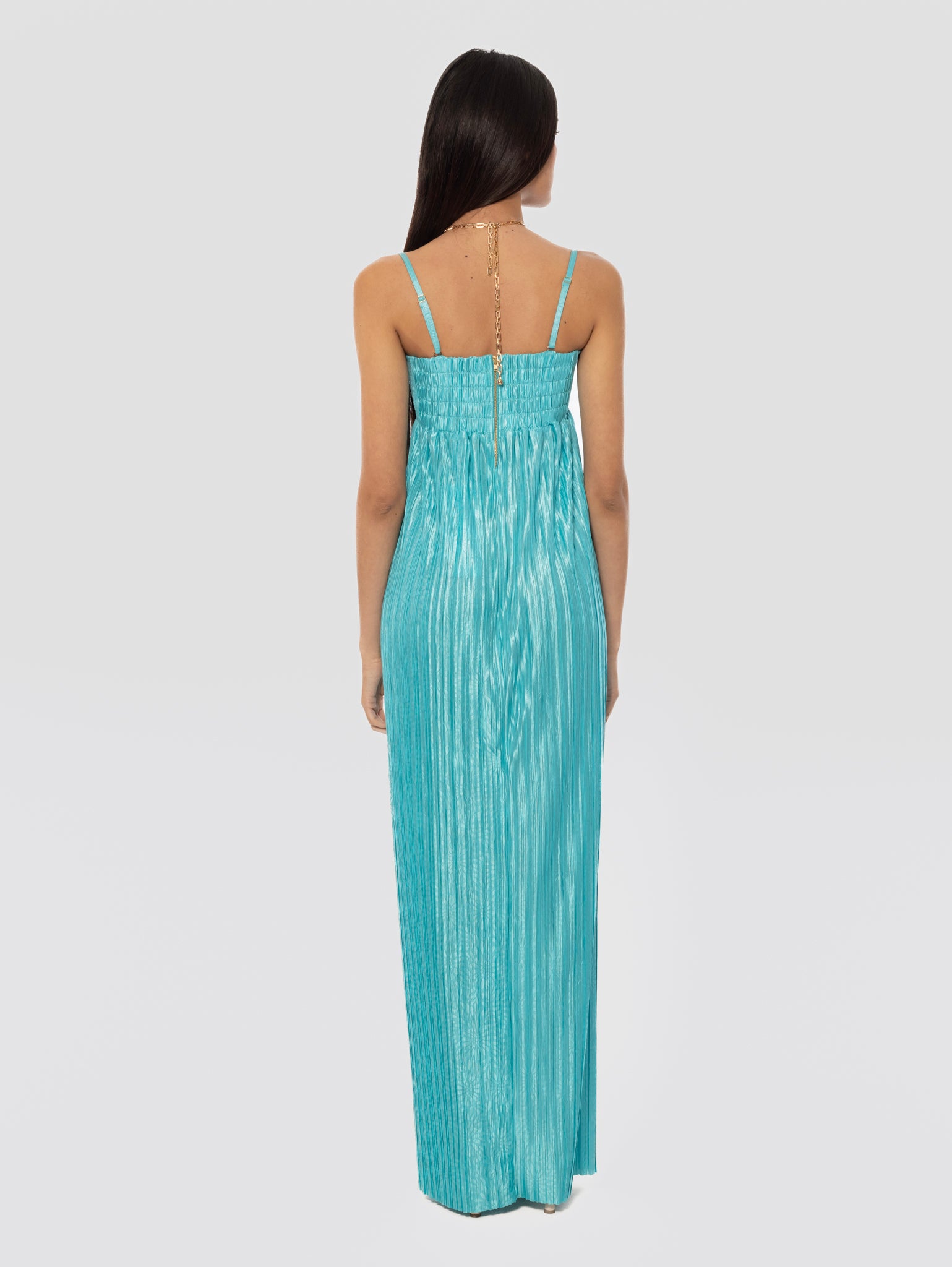 Langes Plissee-Kleid mit türkisfarbenem Blumenmuster