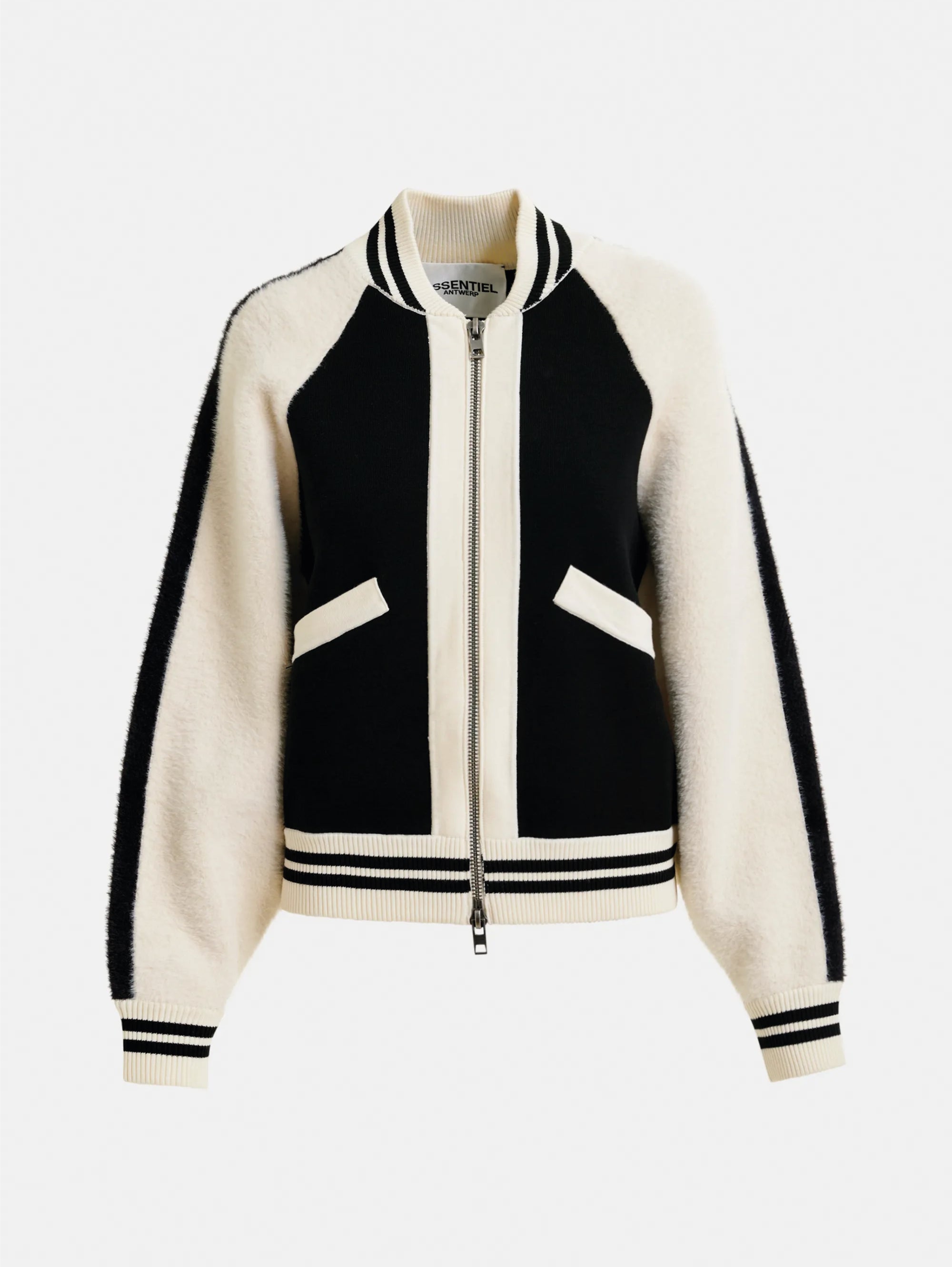 Bomber lavorato a maglia con pannelli in pelliccia ecologica modello Idol da donna di Essentiel Antwerp.