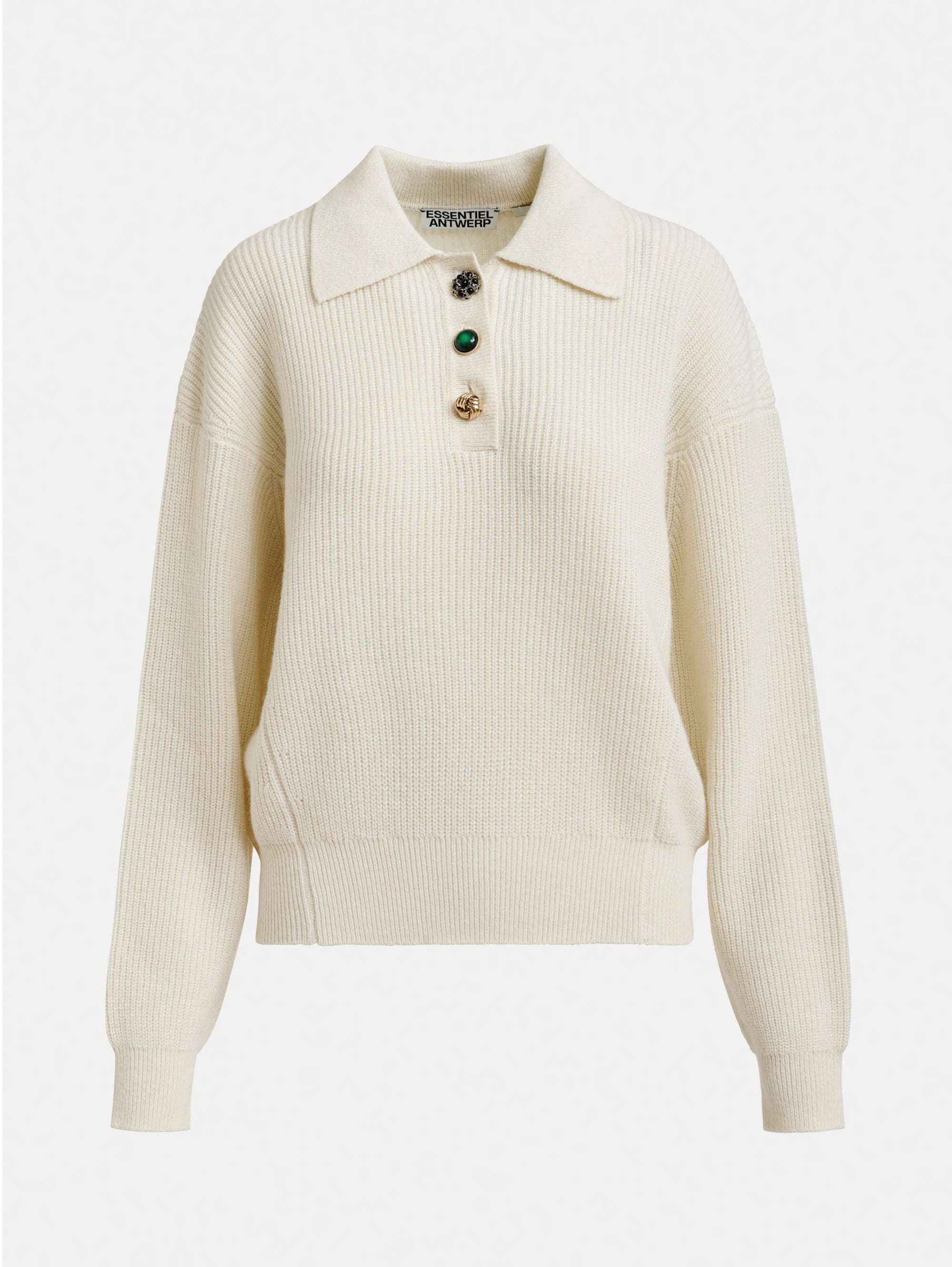 Polo in misto lana a costine con bottoni gioiello modello Imetal da donna di Essentiel Antwerp.