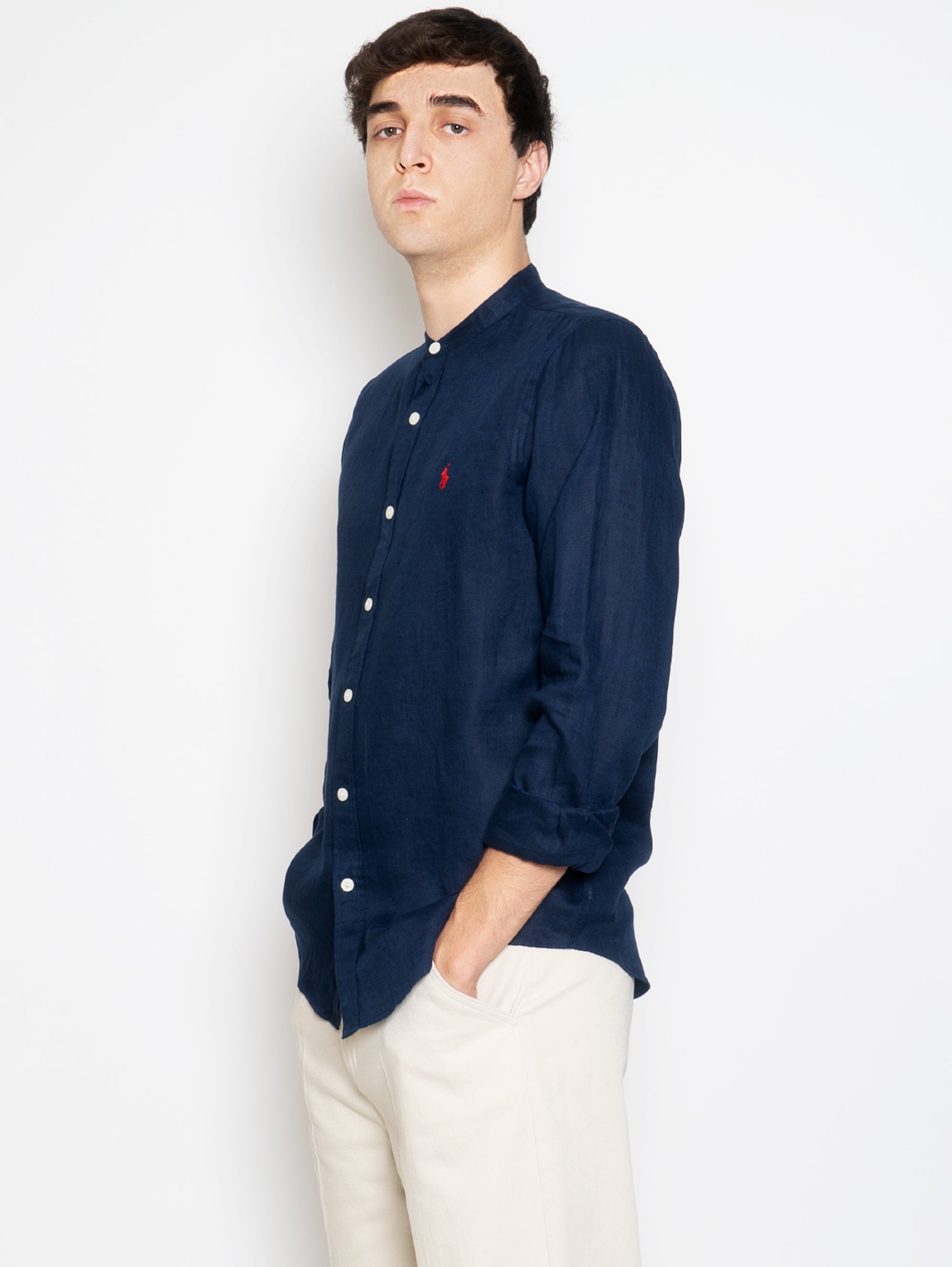Ralph Lauren Herren Slim Fit Leinenhemd mit Stehkragen.