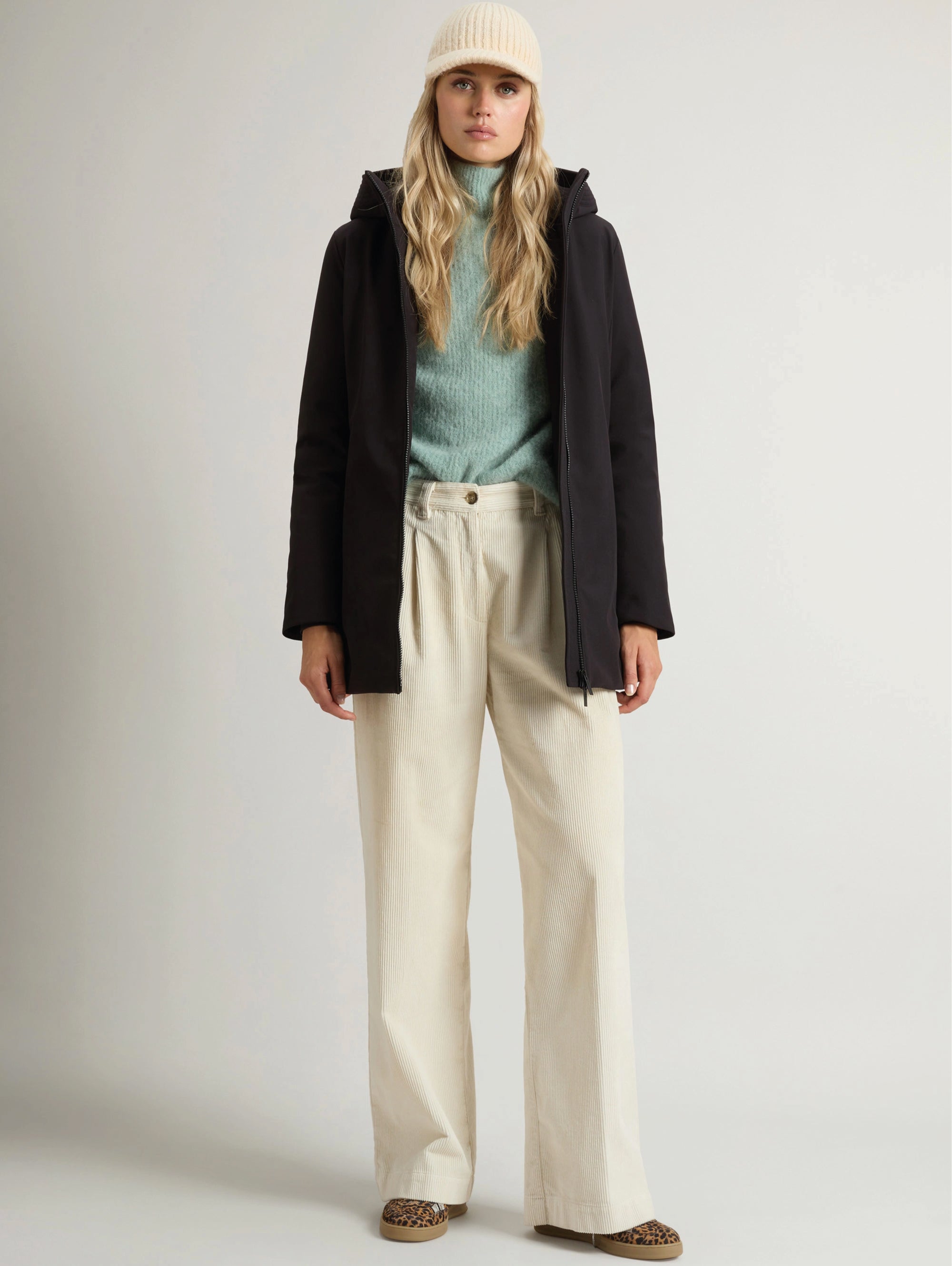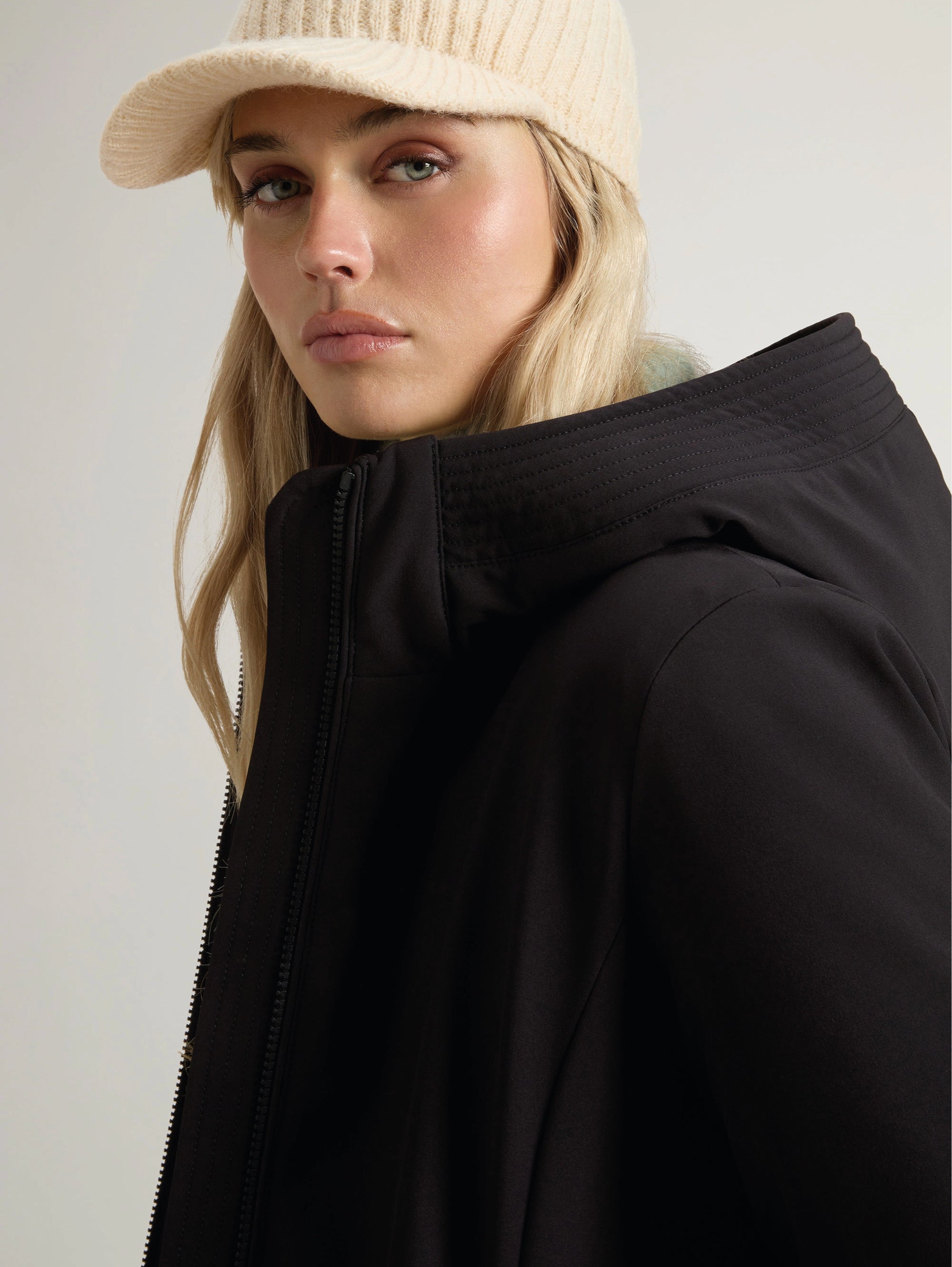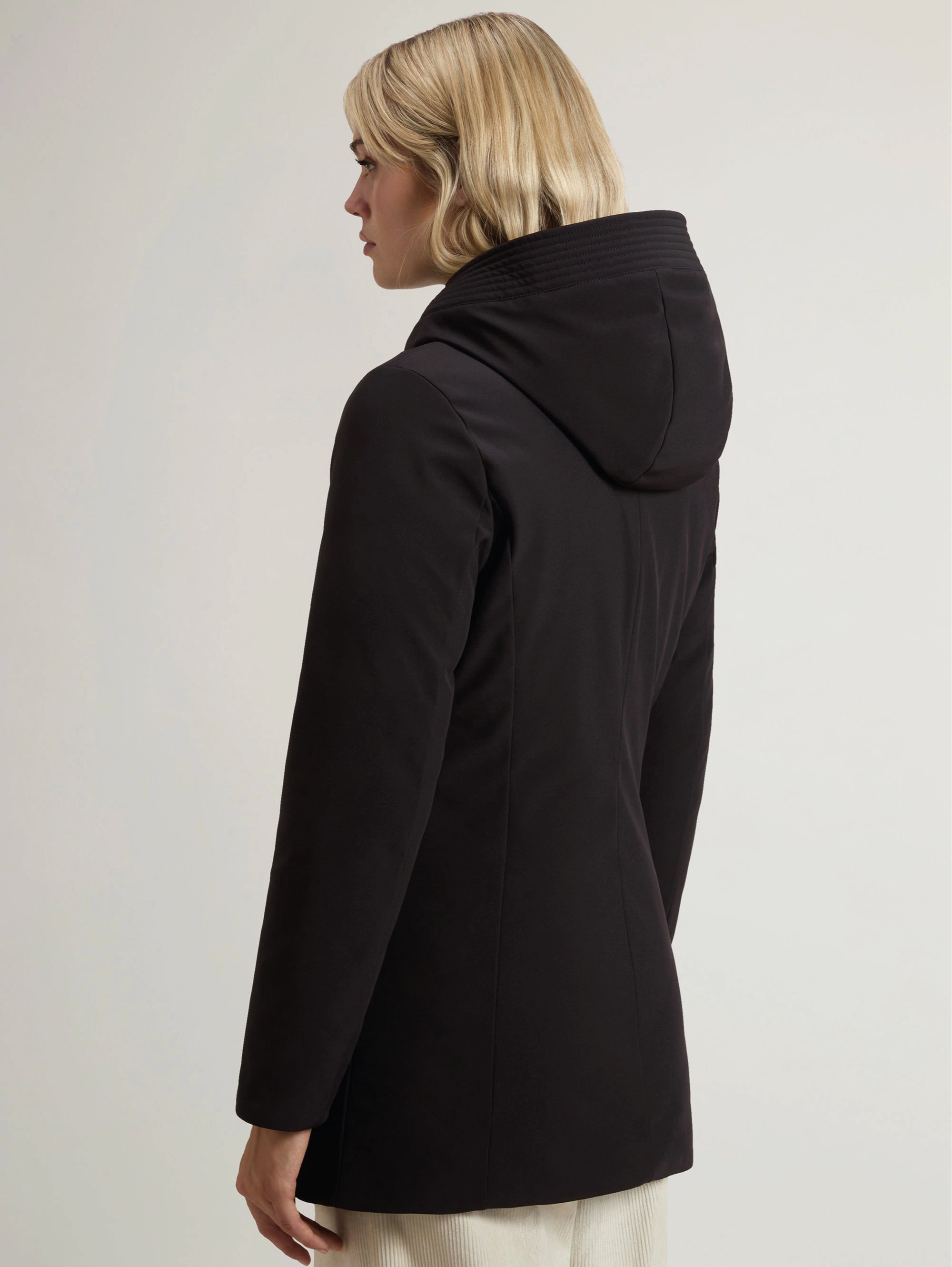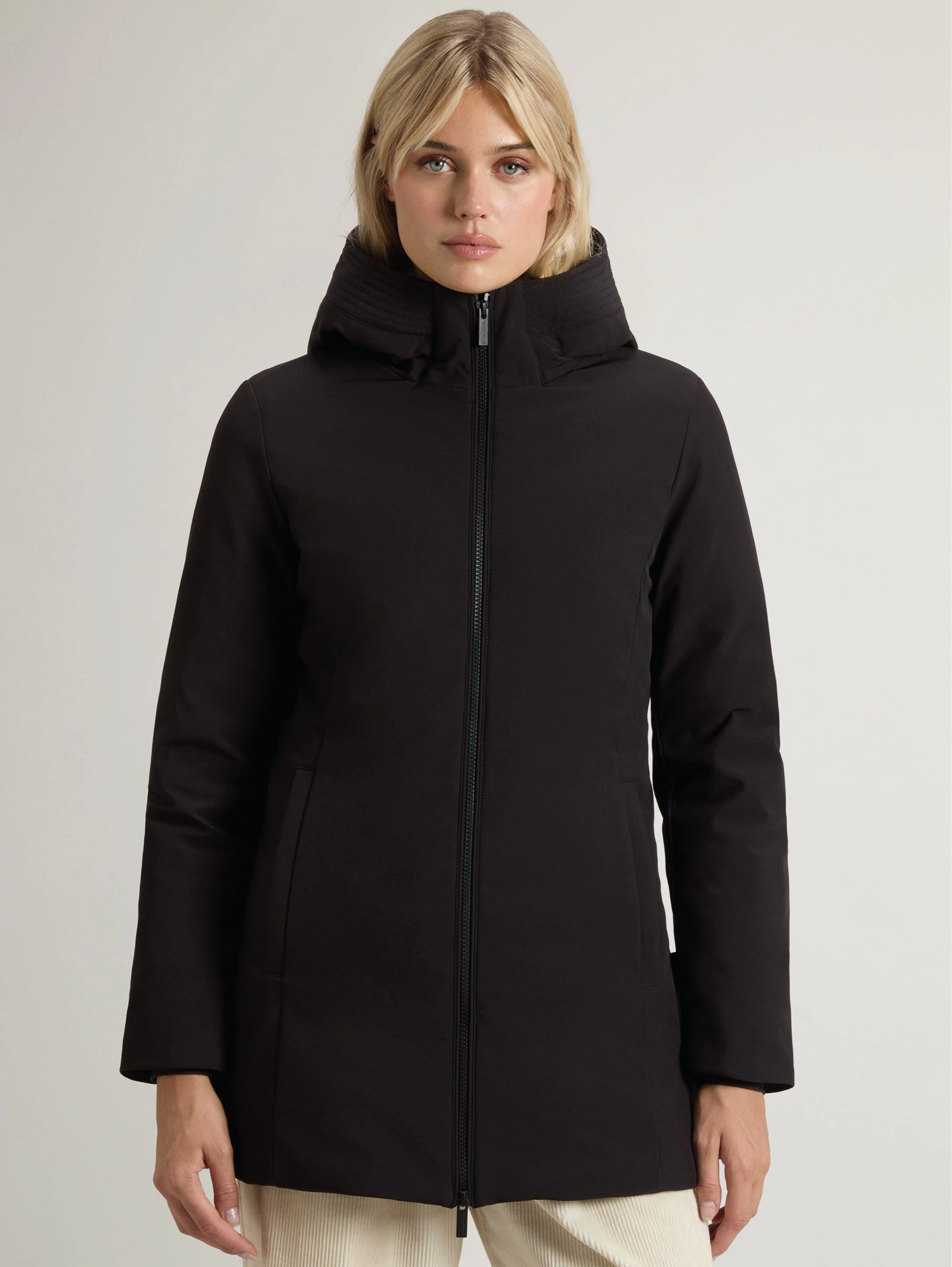 - Parka media lunghezza in tessuto opaco stretch imbottito in piuma