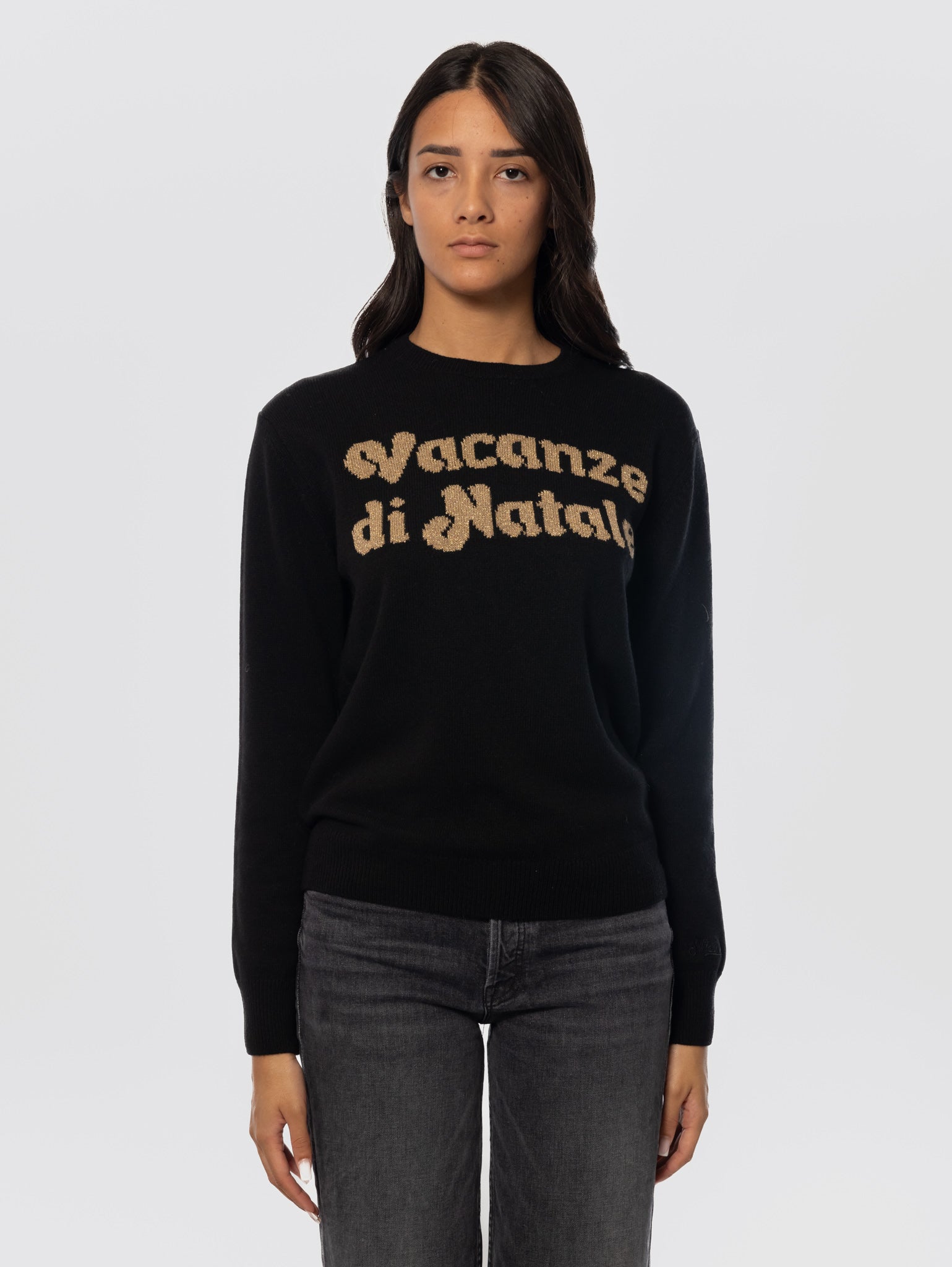 Maglione Girocollo con Ricamo Vacanze di Natale Nero