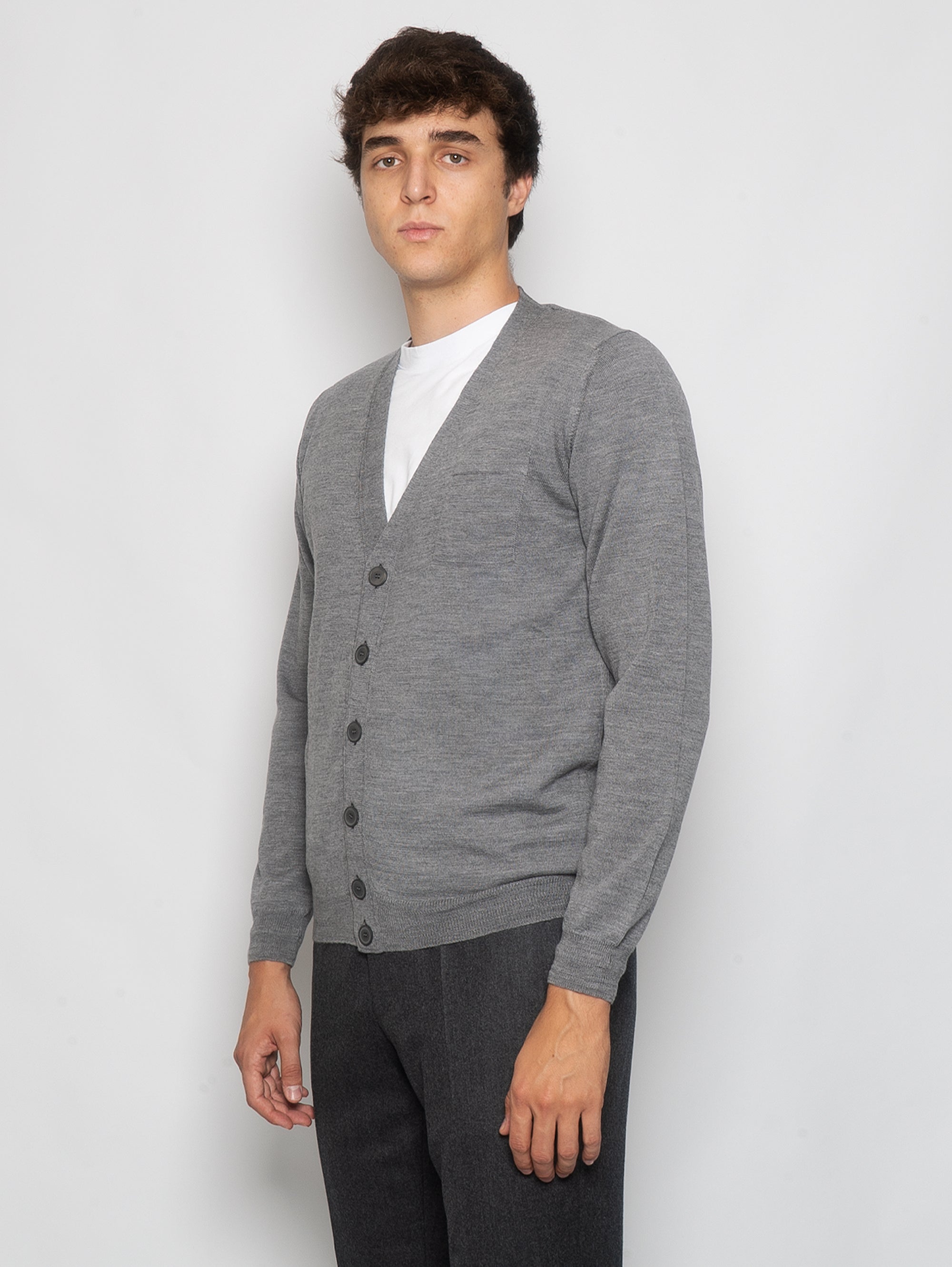 Grauer Merino-Cardigan mit Tasche