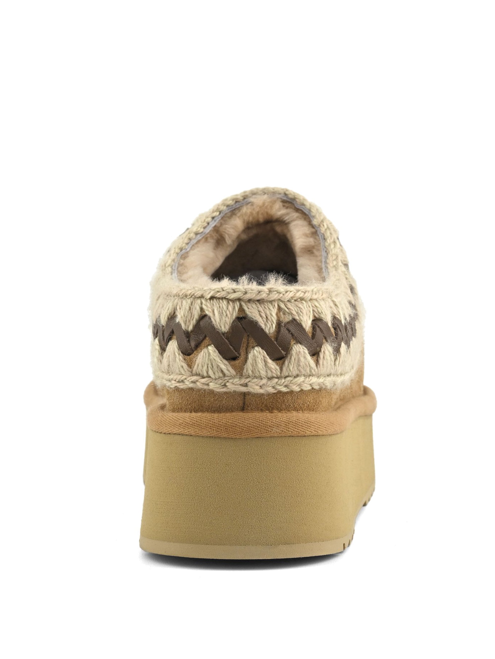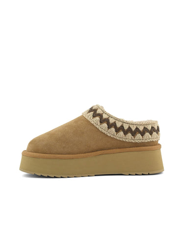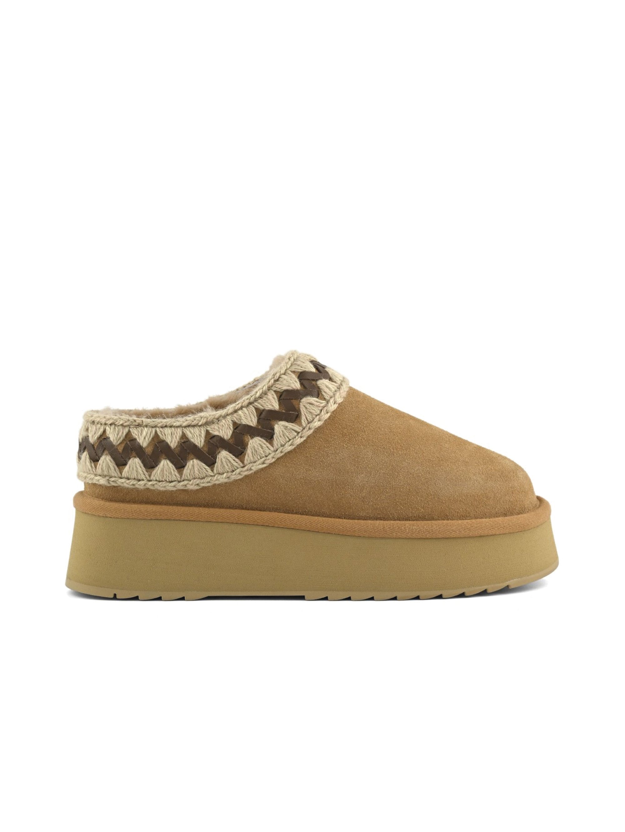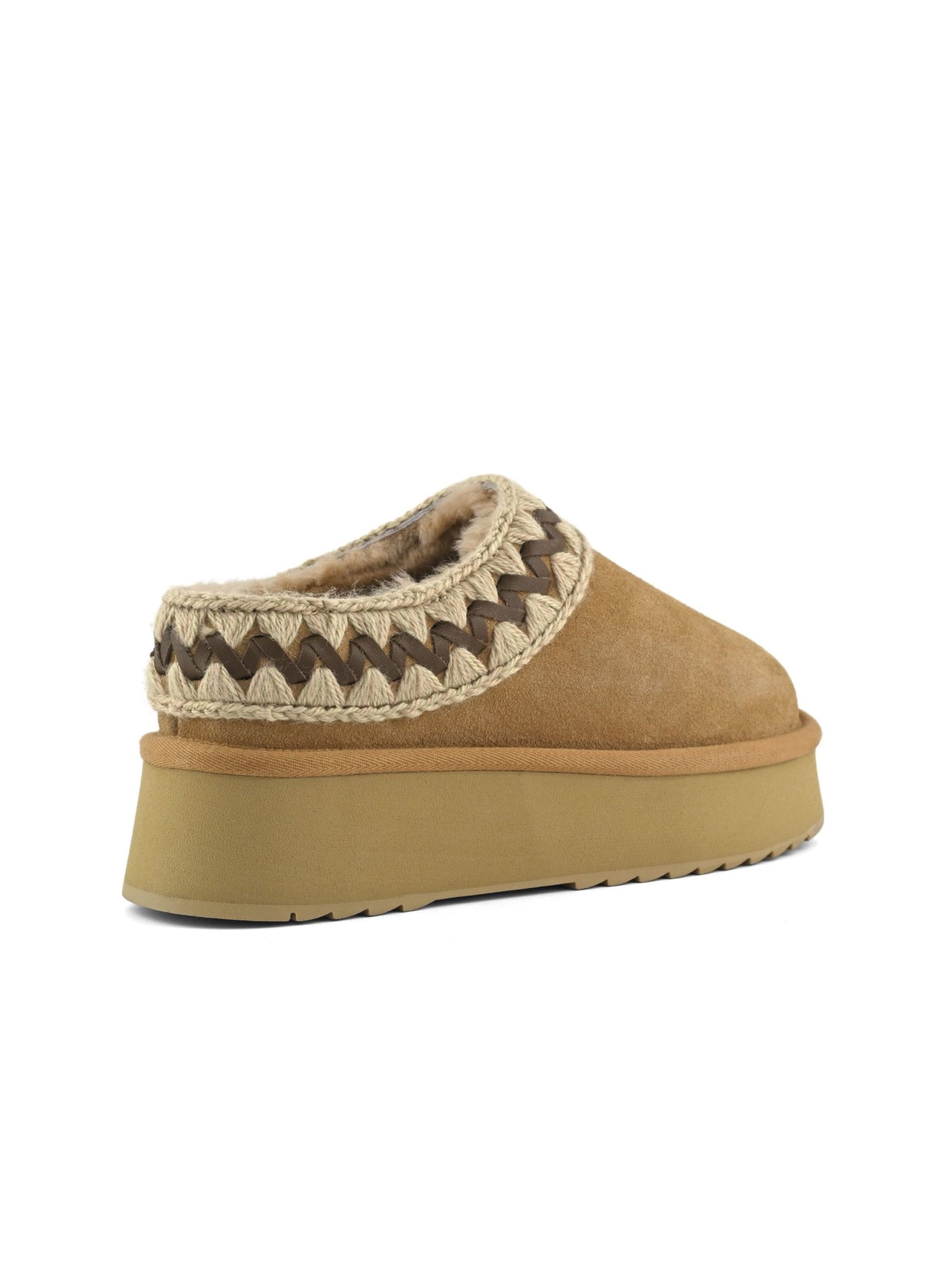 - Morbida pelle di montone e cuciture in lana unite ad una suola rialzata in EVA