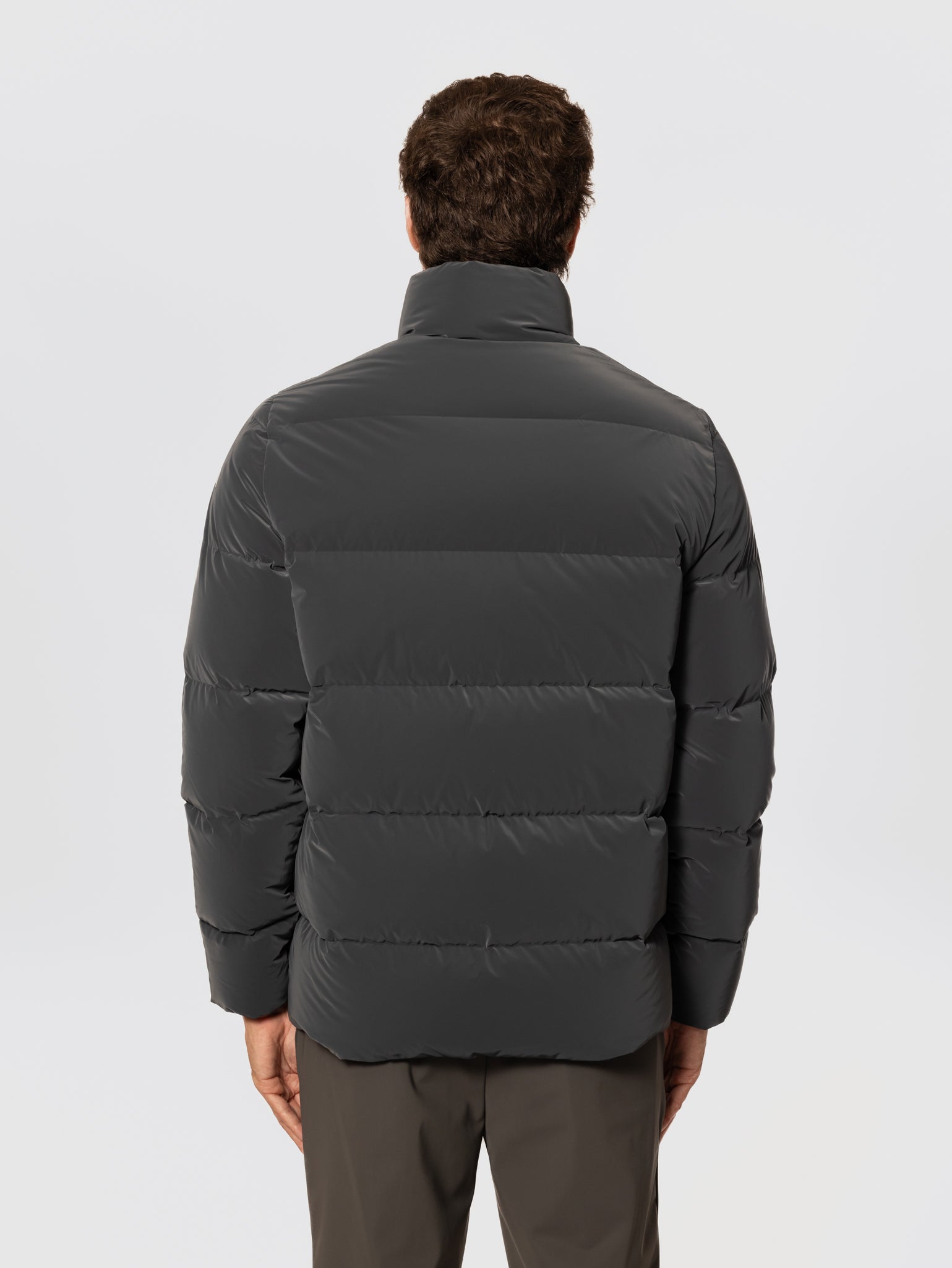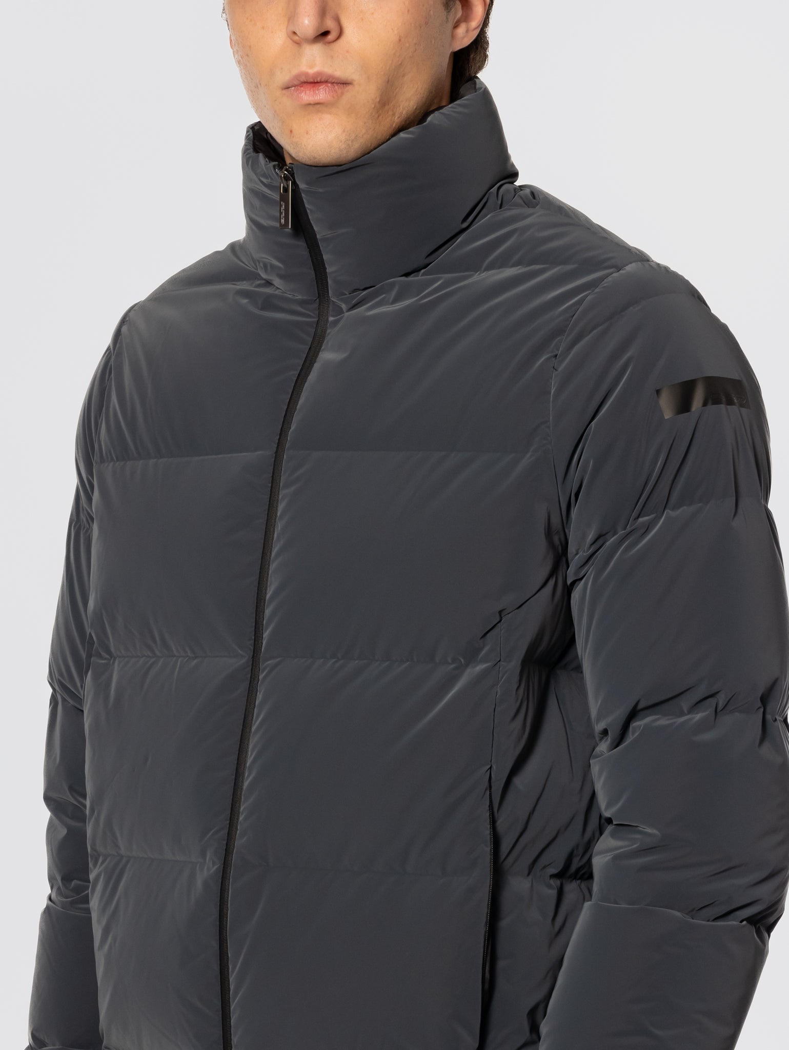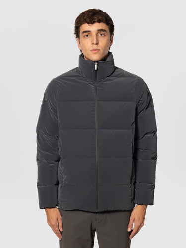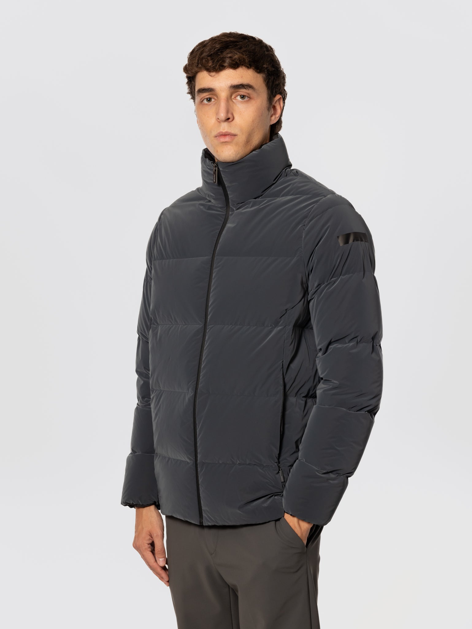 Piumino di lunghezza media e dal fit regolare è definito dall'ampiezza dei canali tubici spalmati a silicone, a effetto delicatamente cangiante modello W25028 da uomo di RRD.