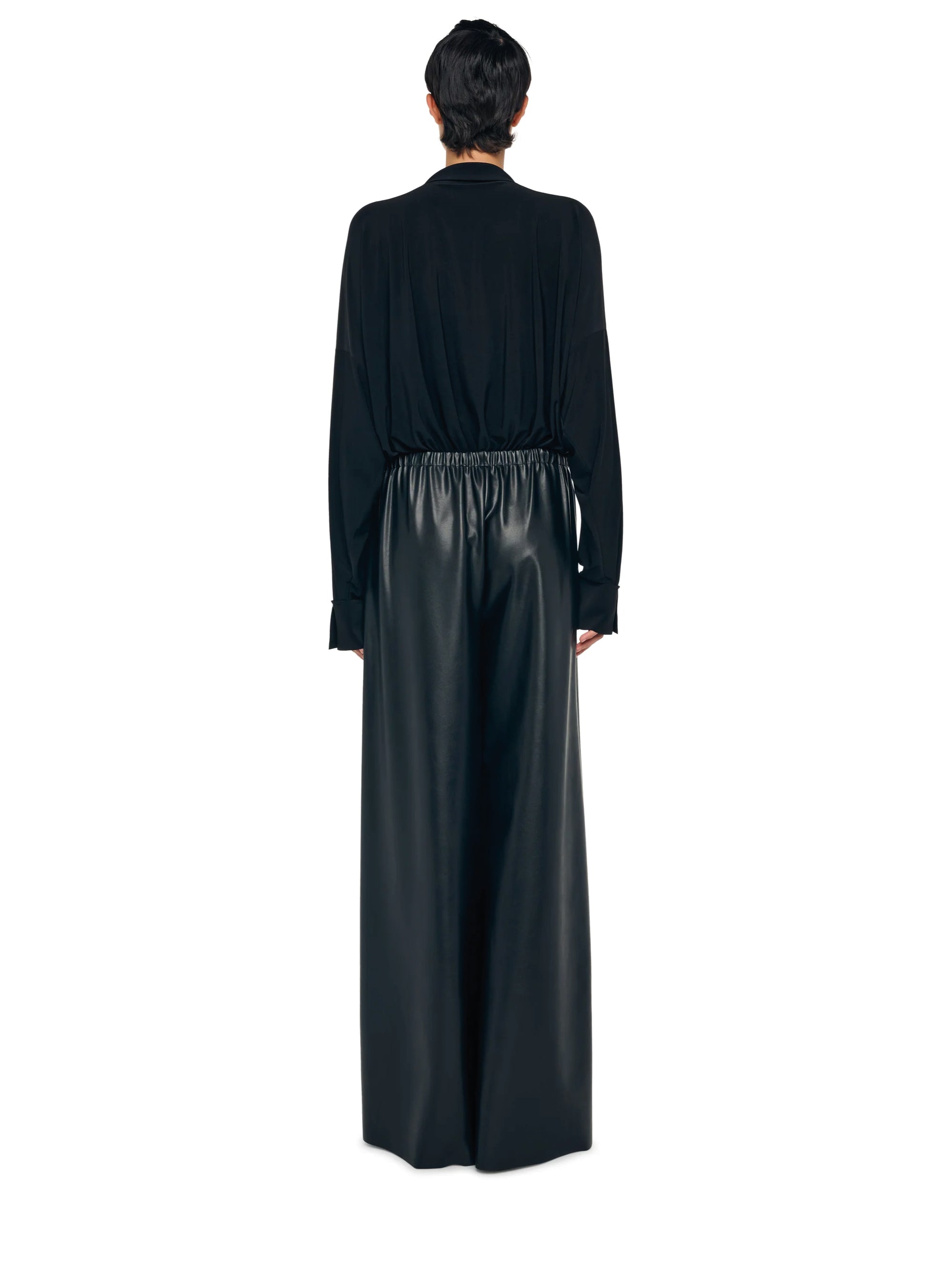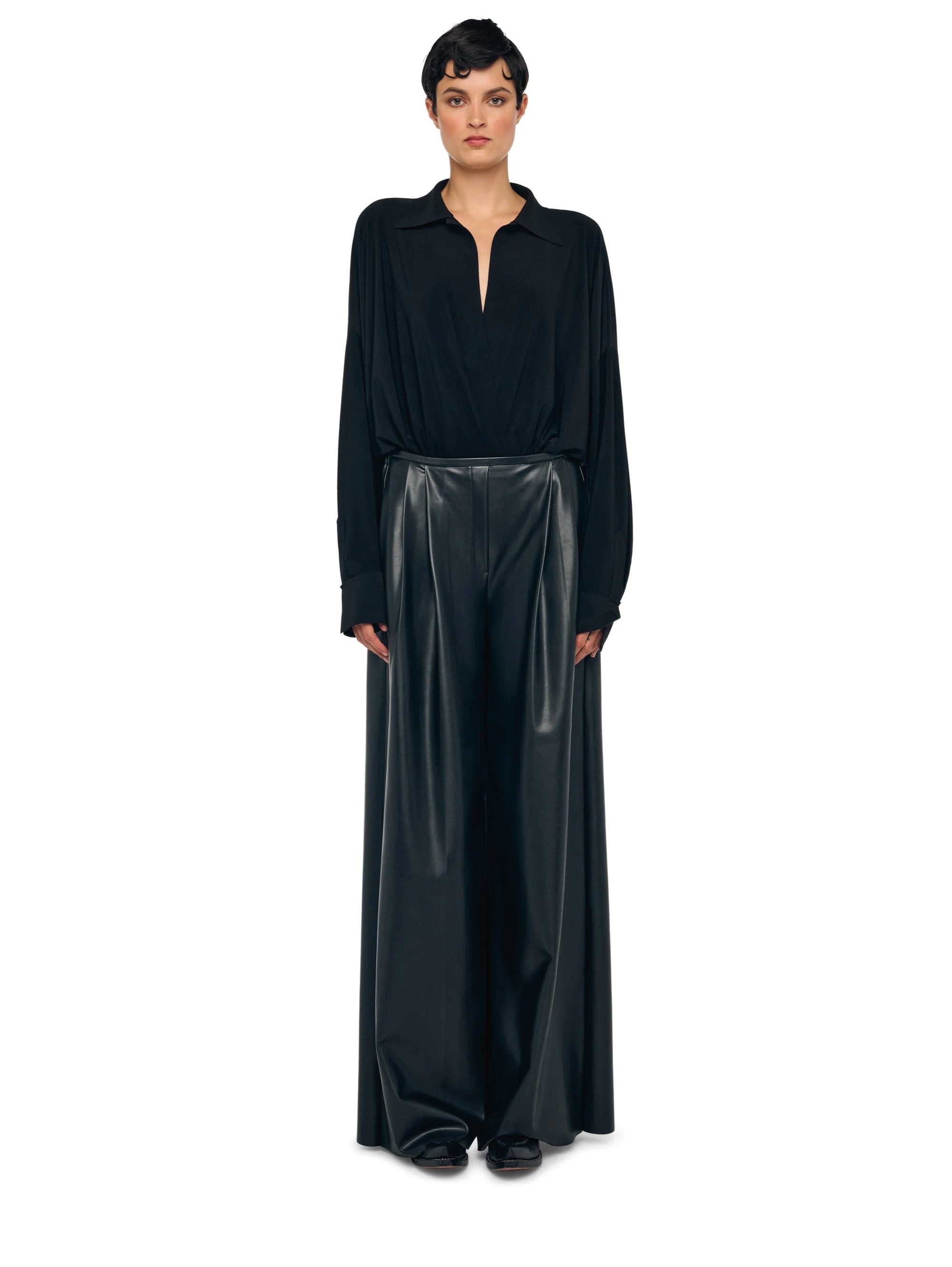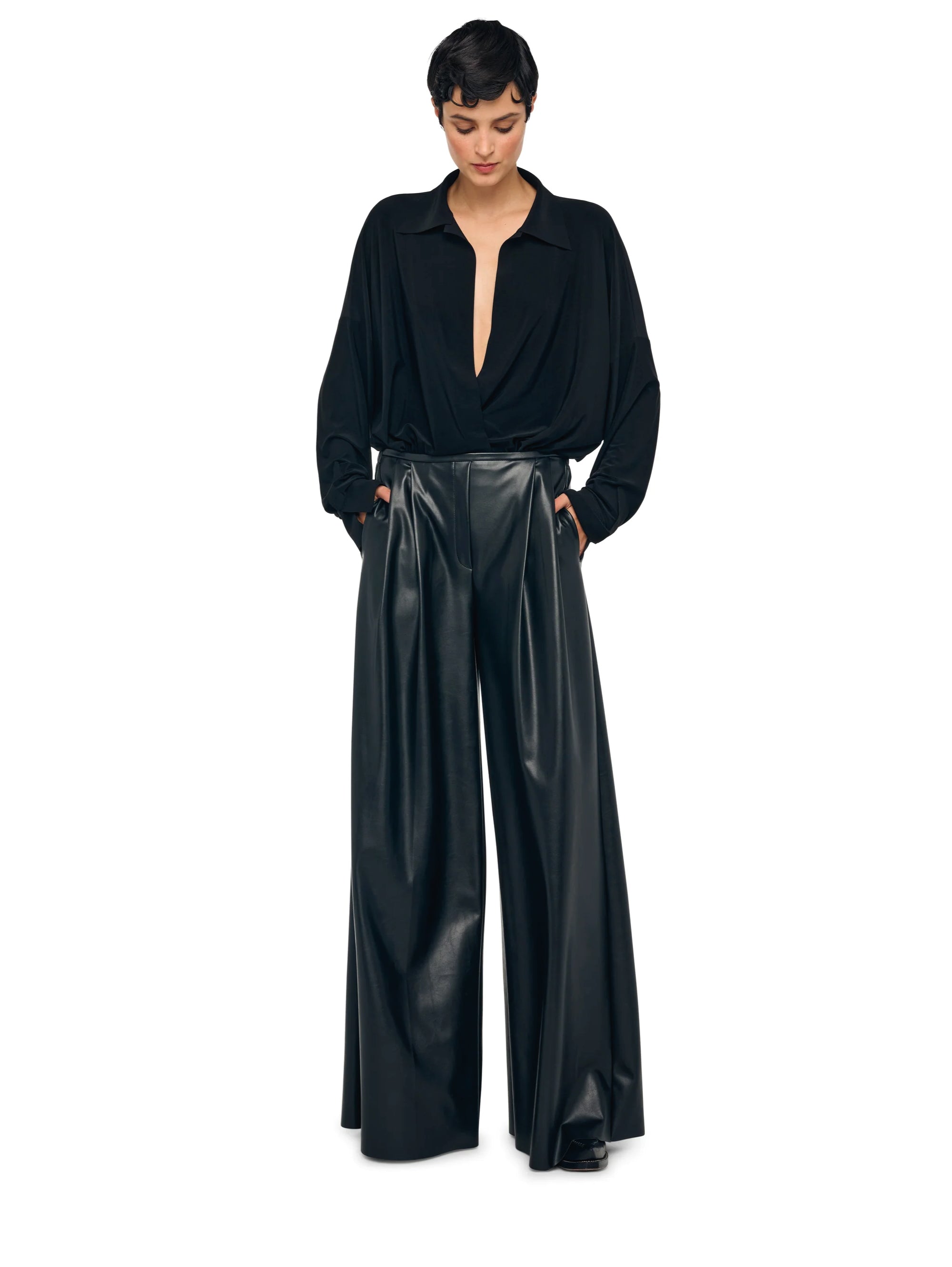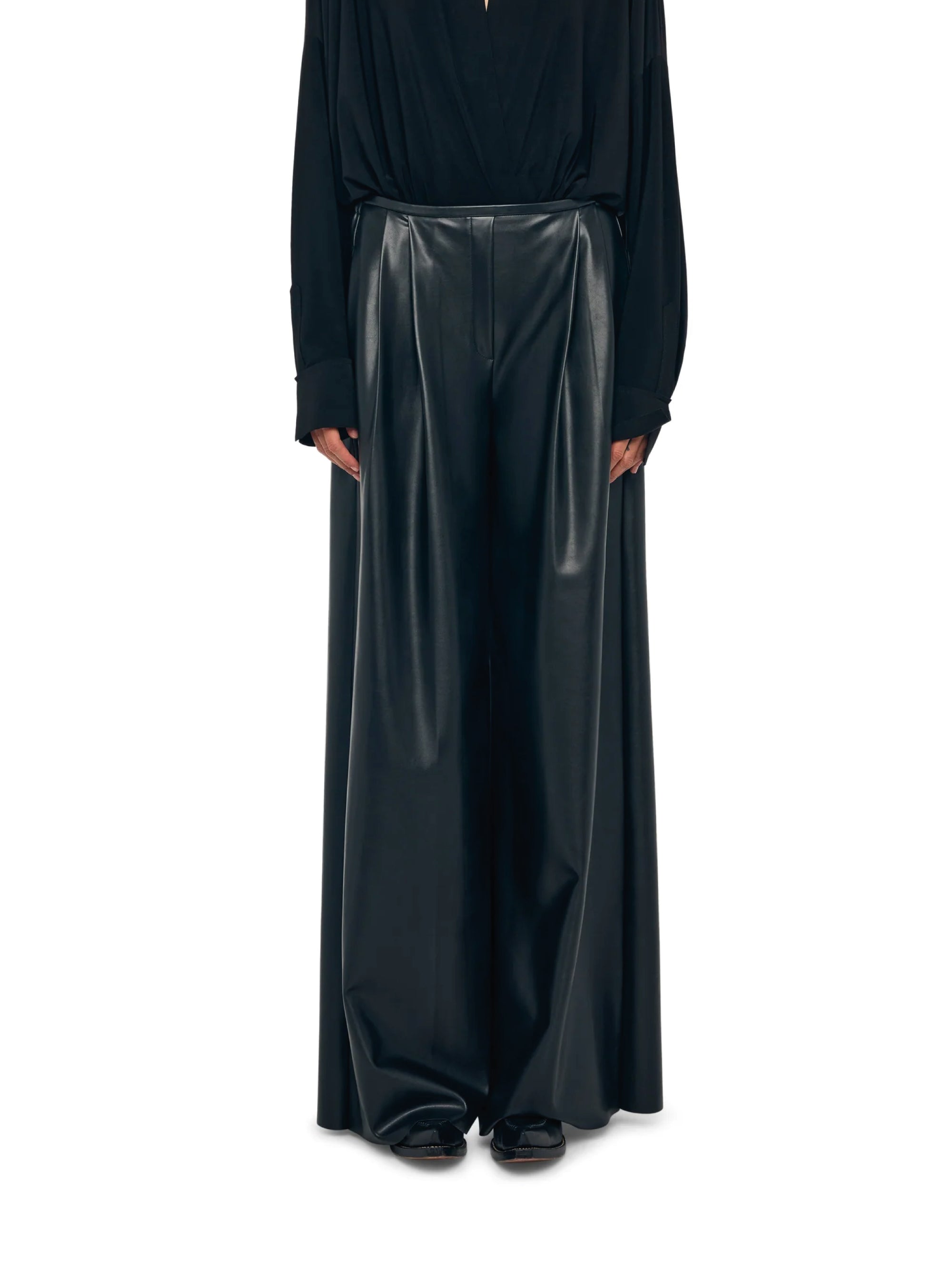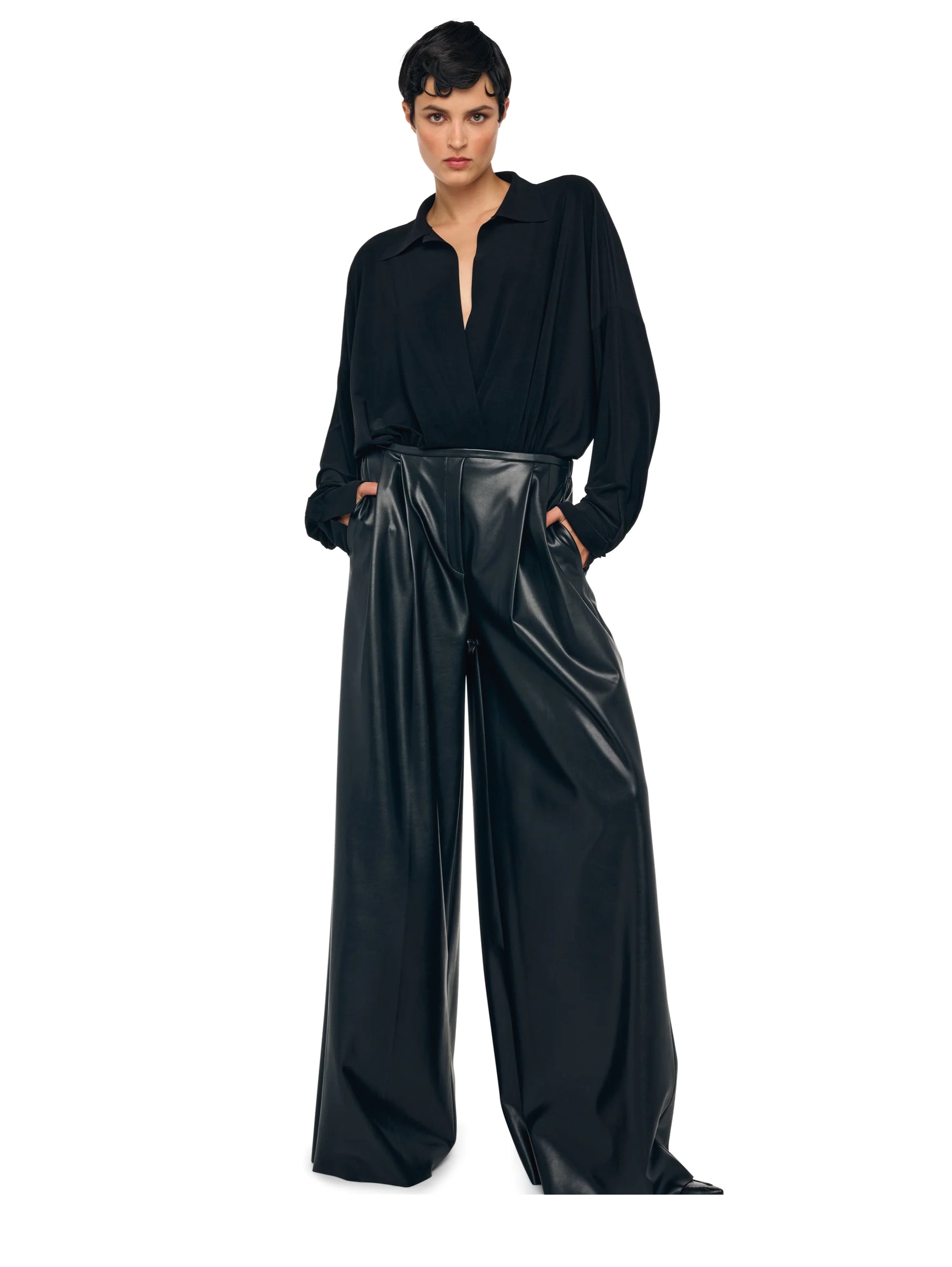 Pantaloni in ecopelle a vita alta plissé modello Mens Pleat Pant da donna di Norma Kamali.