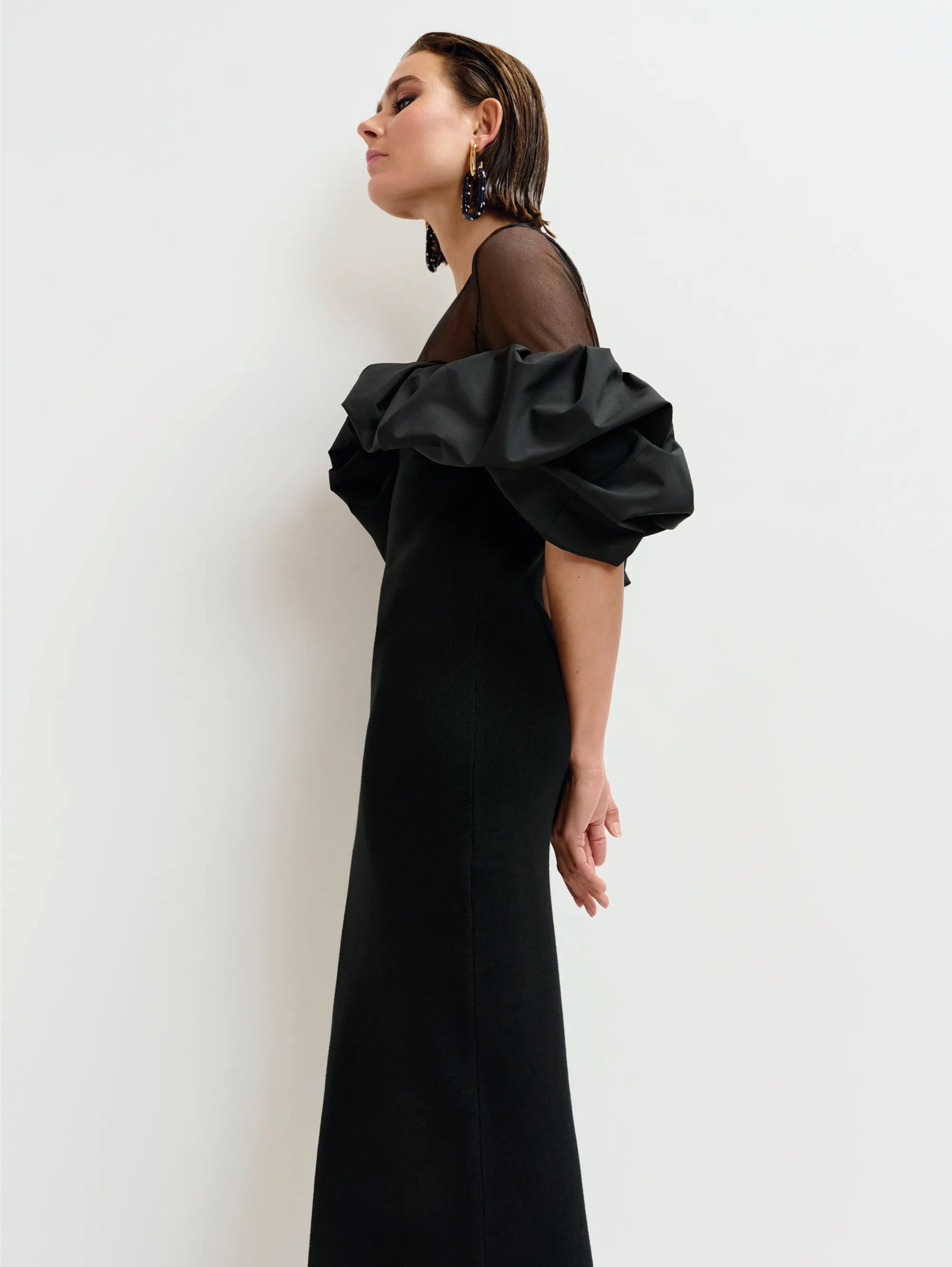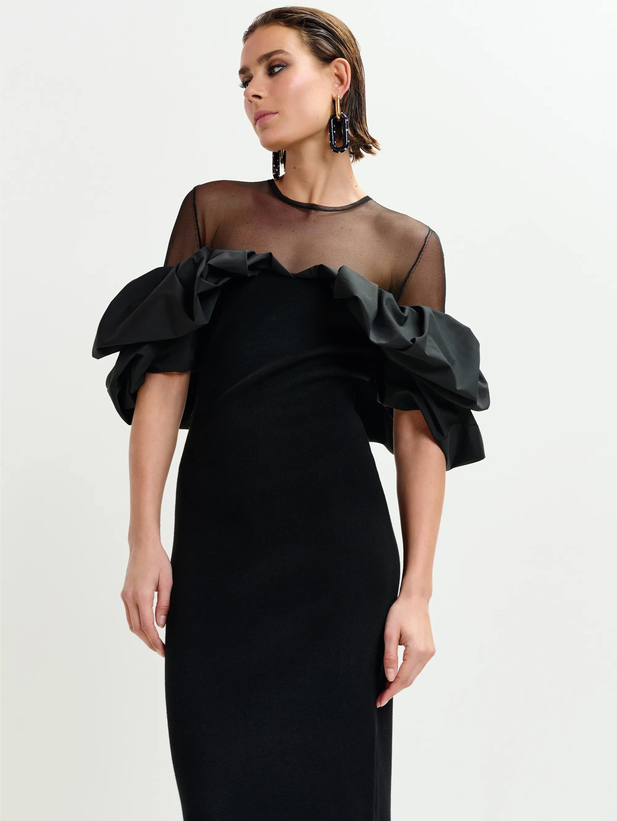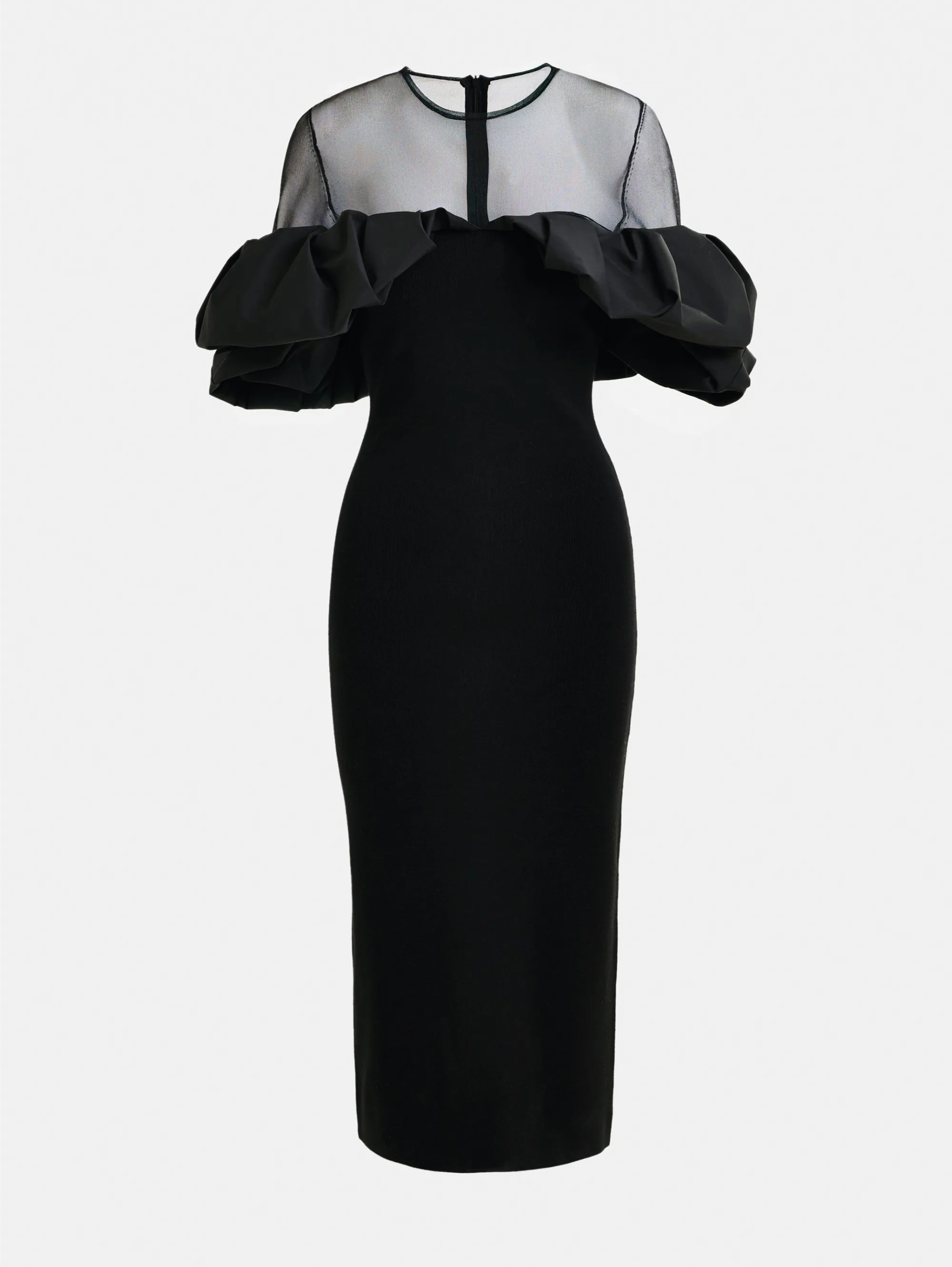 - Abito lungo in maglina a coste aderente con voluminosi volant