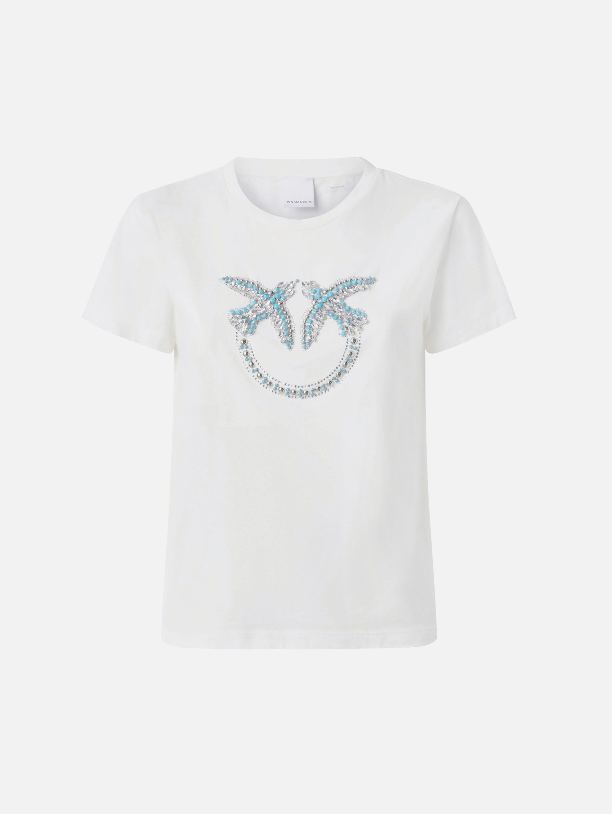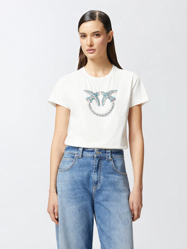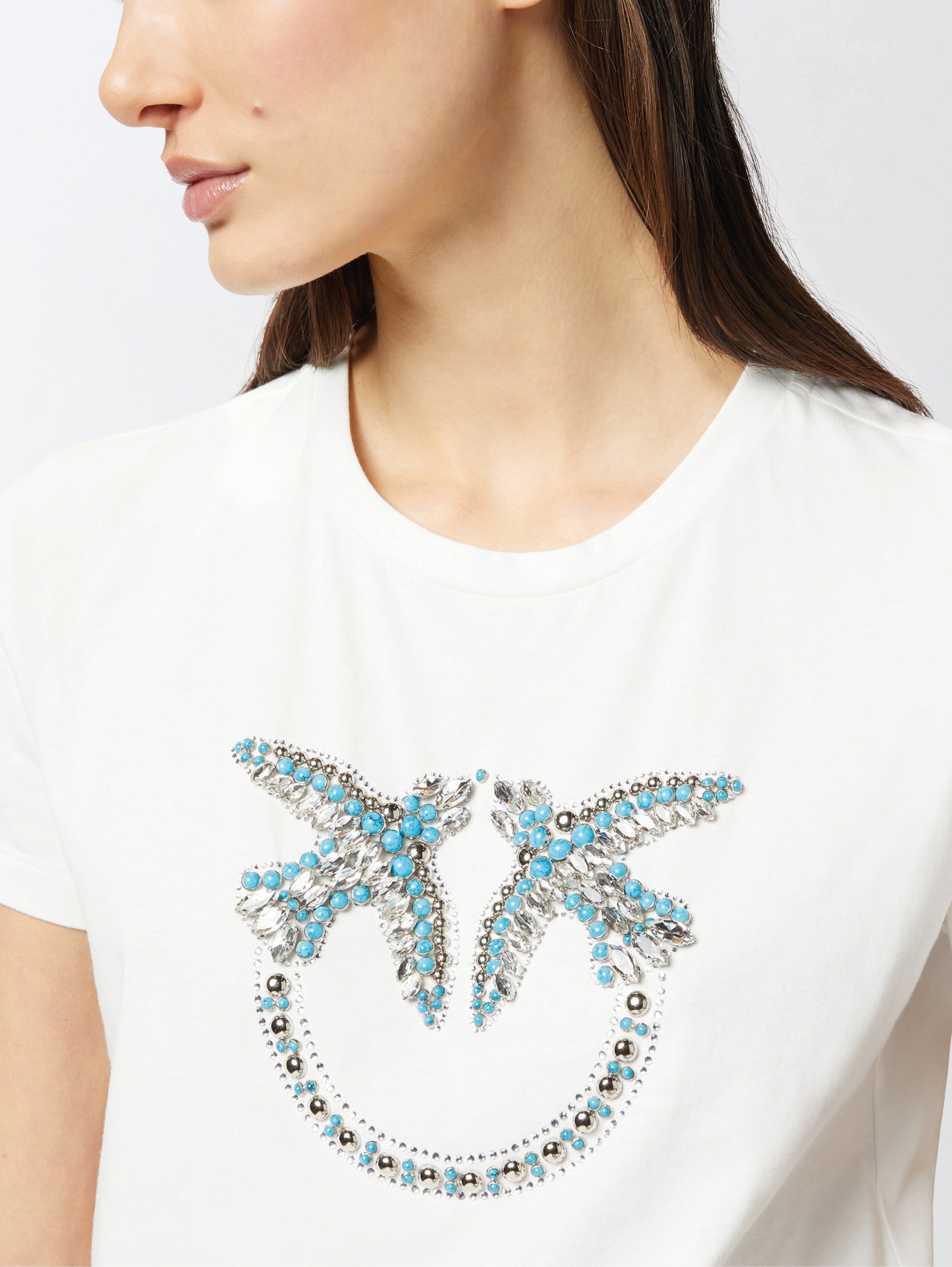 Short-sleeved cotton jersey T-shirt with maxi Love Birds embroidery with beads and crystals, Quentin model for women by Pinko.