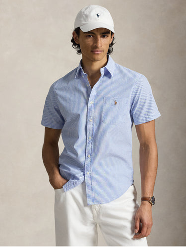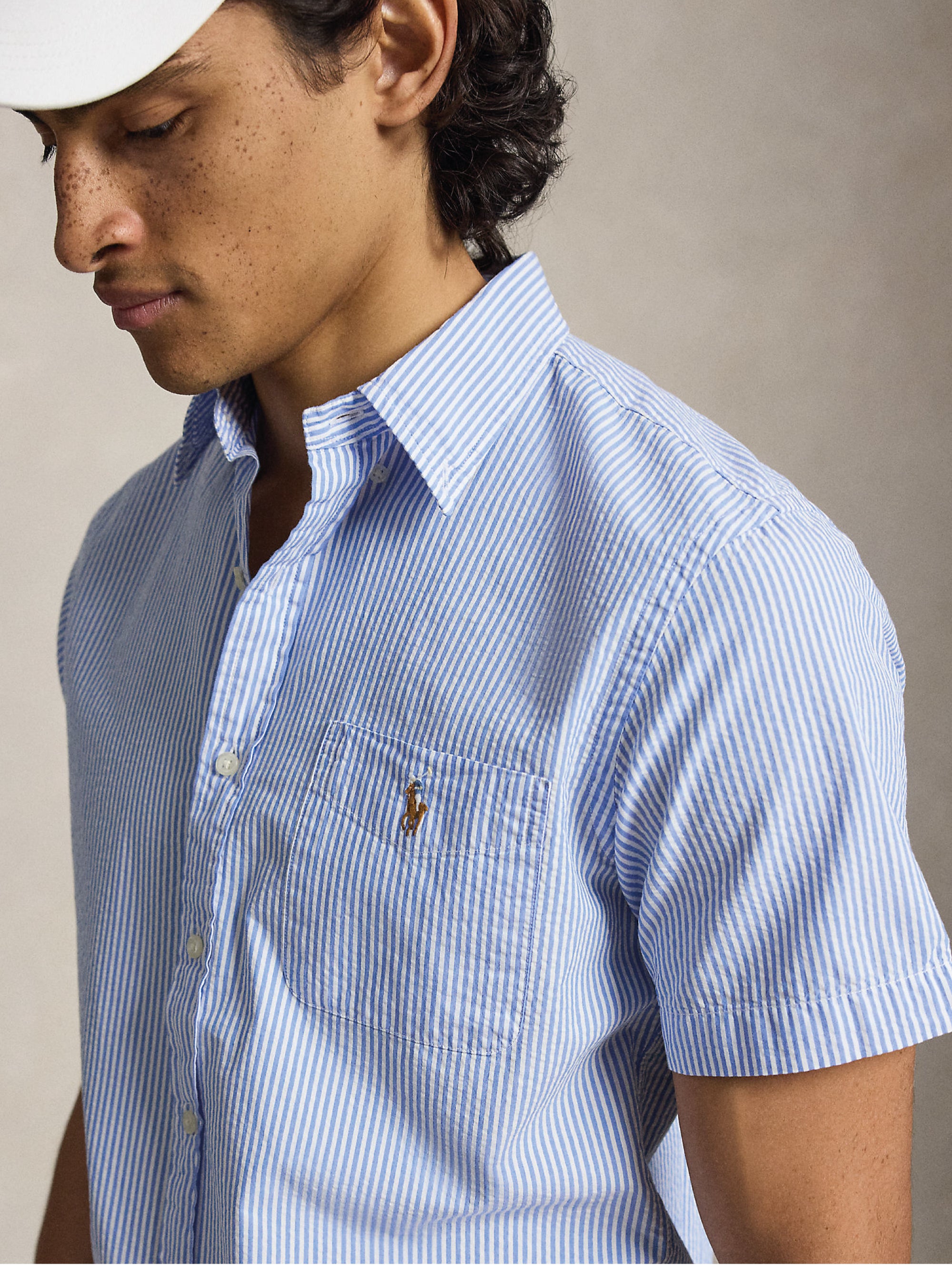 Camicia maniche corte in cotone seersucker a righe da uomo di Polo Ralph Lauren.