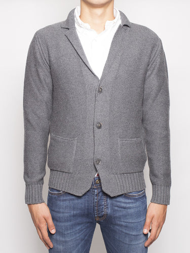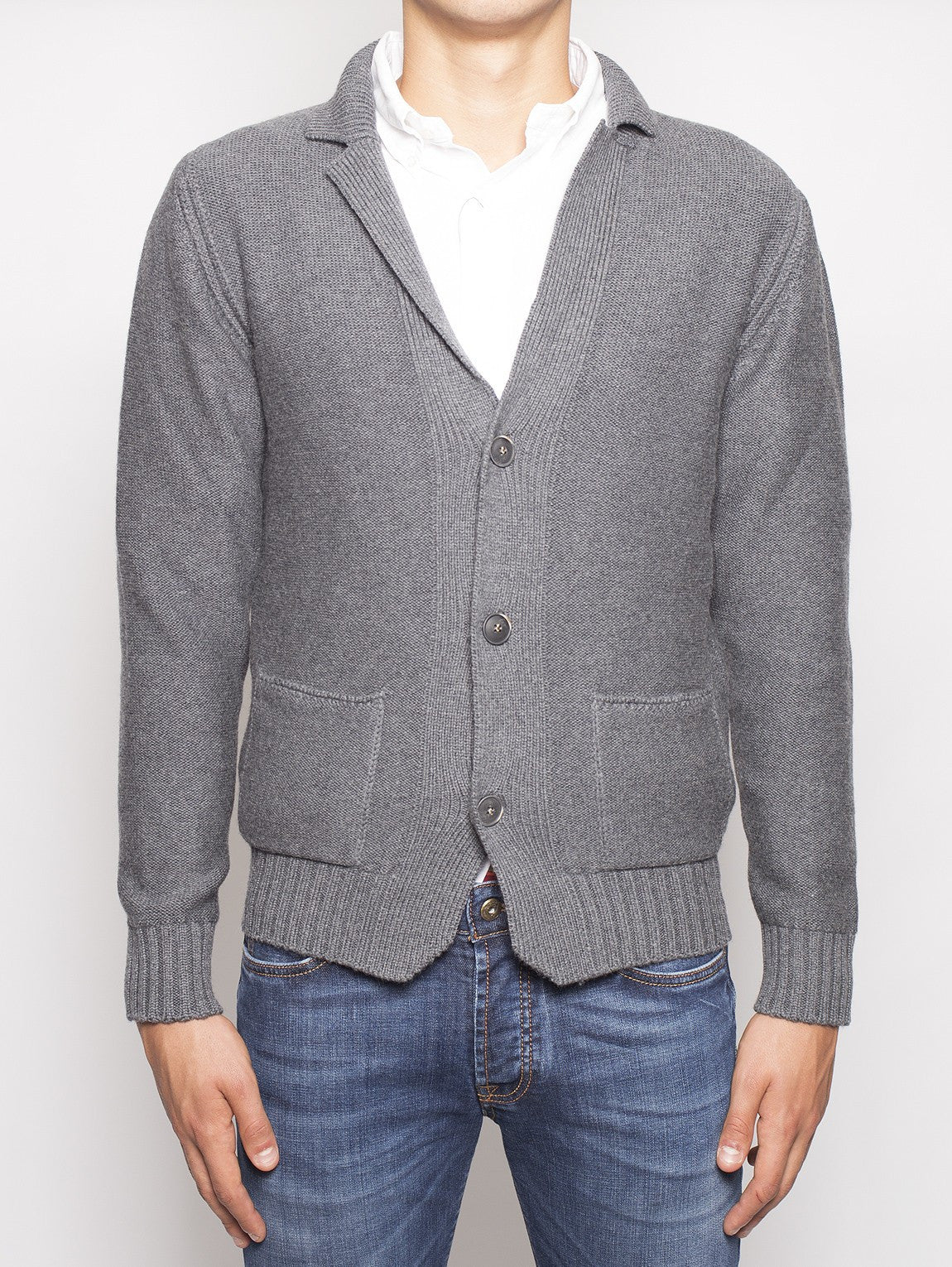 Giacca in maglia da uomo di Alpha Studio modello AU4052E in lana merinos. Dotata di chiusura con tre bottoni, tasche a toppa e profili a coste. Fit slim.