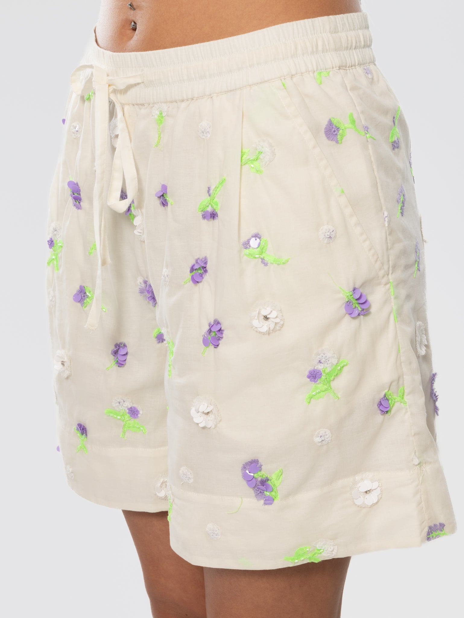 Pantaloncini in Cotone con Ricami e Pailletes Bianchi