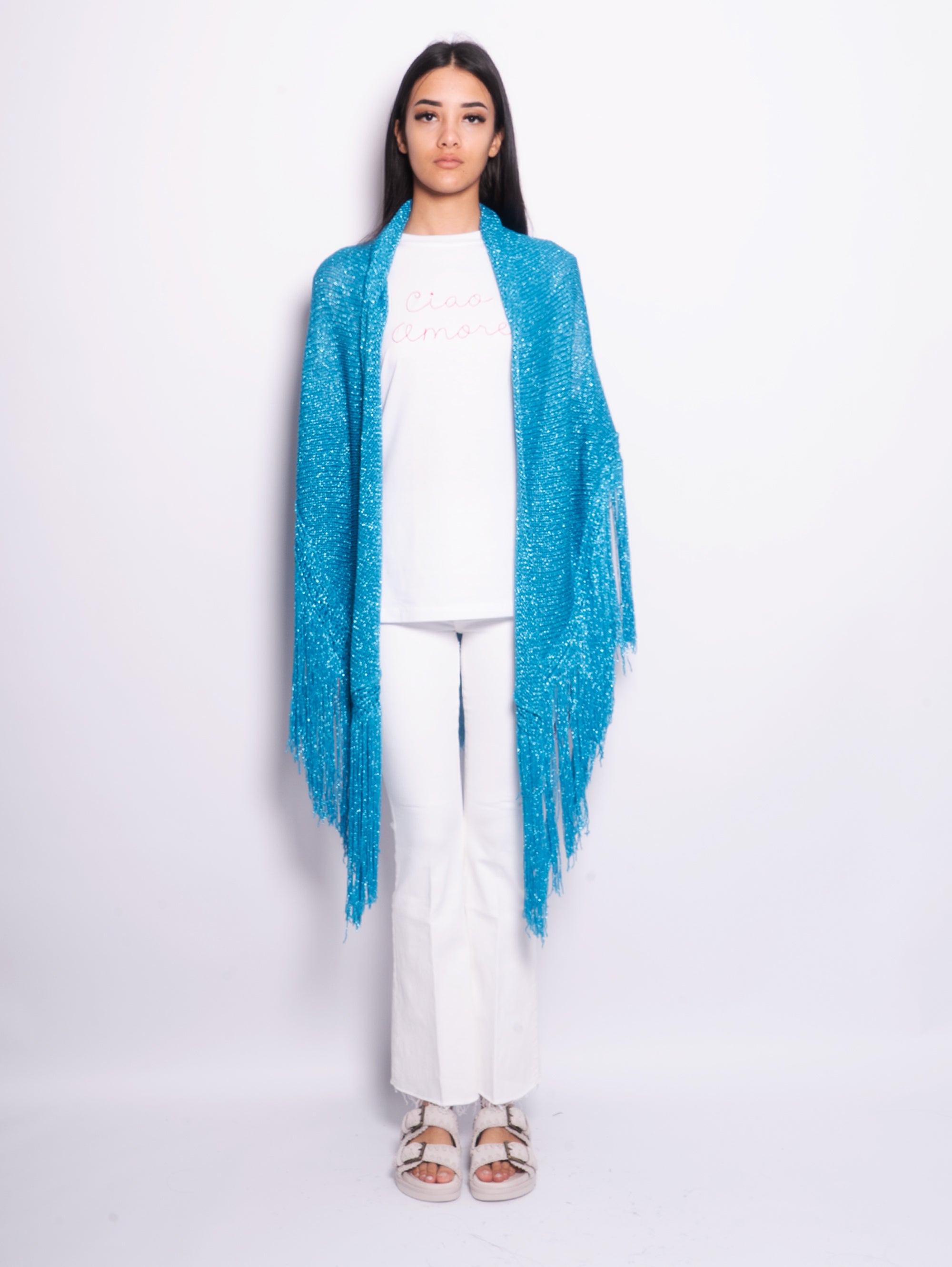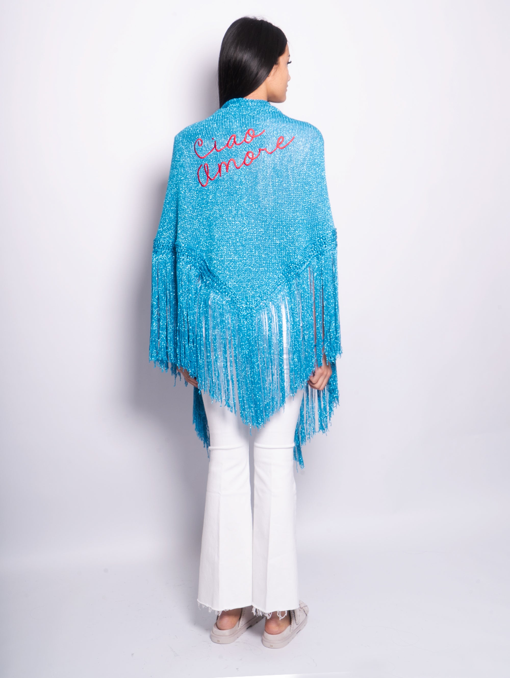 - Scialle in maglia di lurex a frange con ricamo "Ciao Amore"