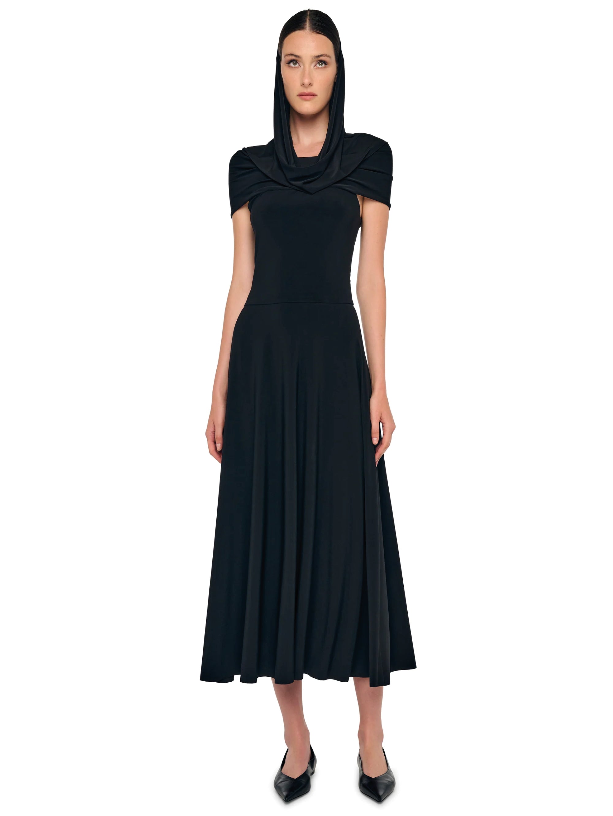 - Cod. KK1263PLT51001 - SLEEVELESS COWL NECK HOODED FLARED DRESS TO MIDCALF - NERO