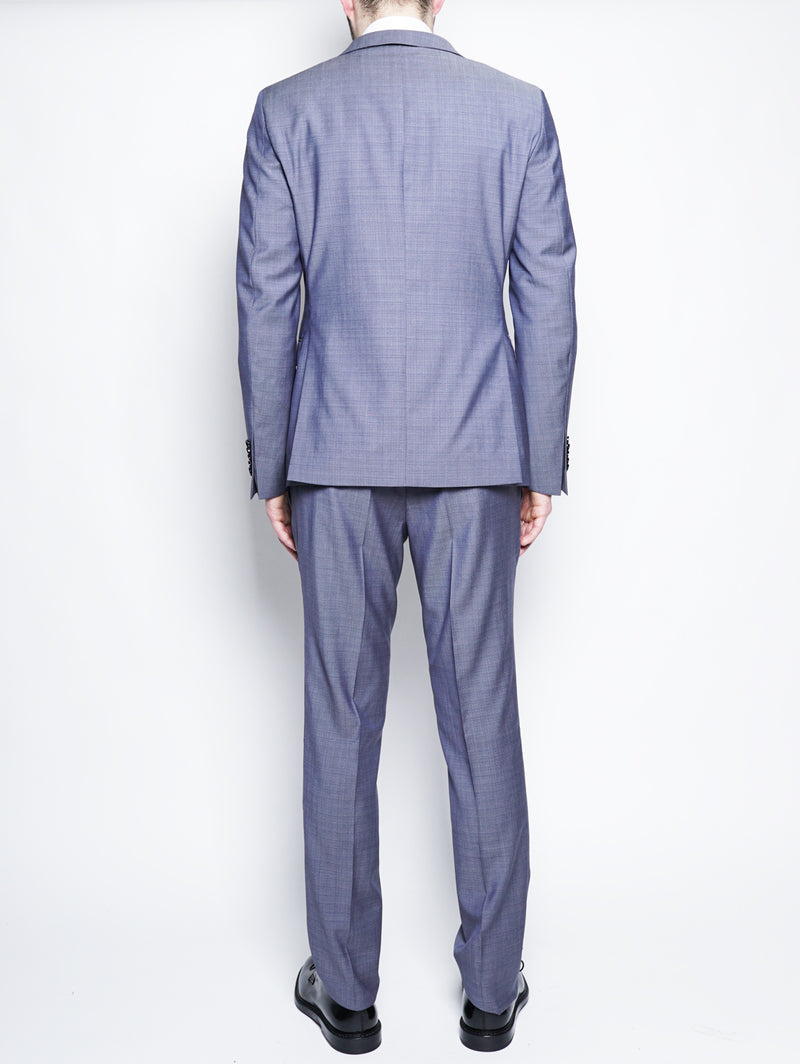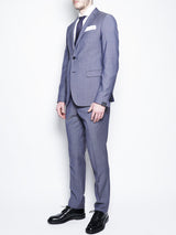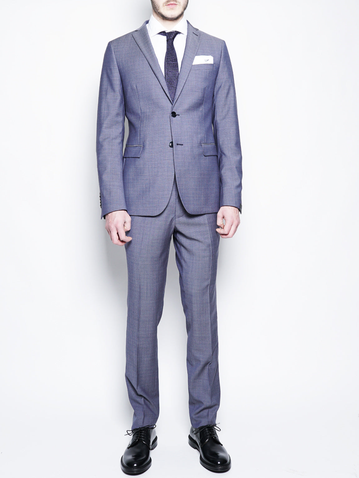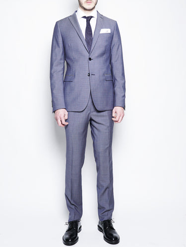 Completo giacca e pantalone da uomo di Paoloni. Comprende giacca dotata di chiusura con due bottoni, quattro bottoni ai polsi con asole, una tasca sul petto e due tasche frontali. Tre tasche interne e doppio spacco sul retro. Pantalone con chiusura con bottone, gancio e zip, due tasche laterali e due tasche sul retro chiuse da bottone. Fondo consegnato sfilato per finiture sartoriali. Slim fit.