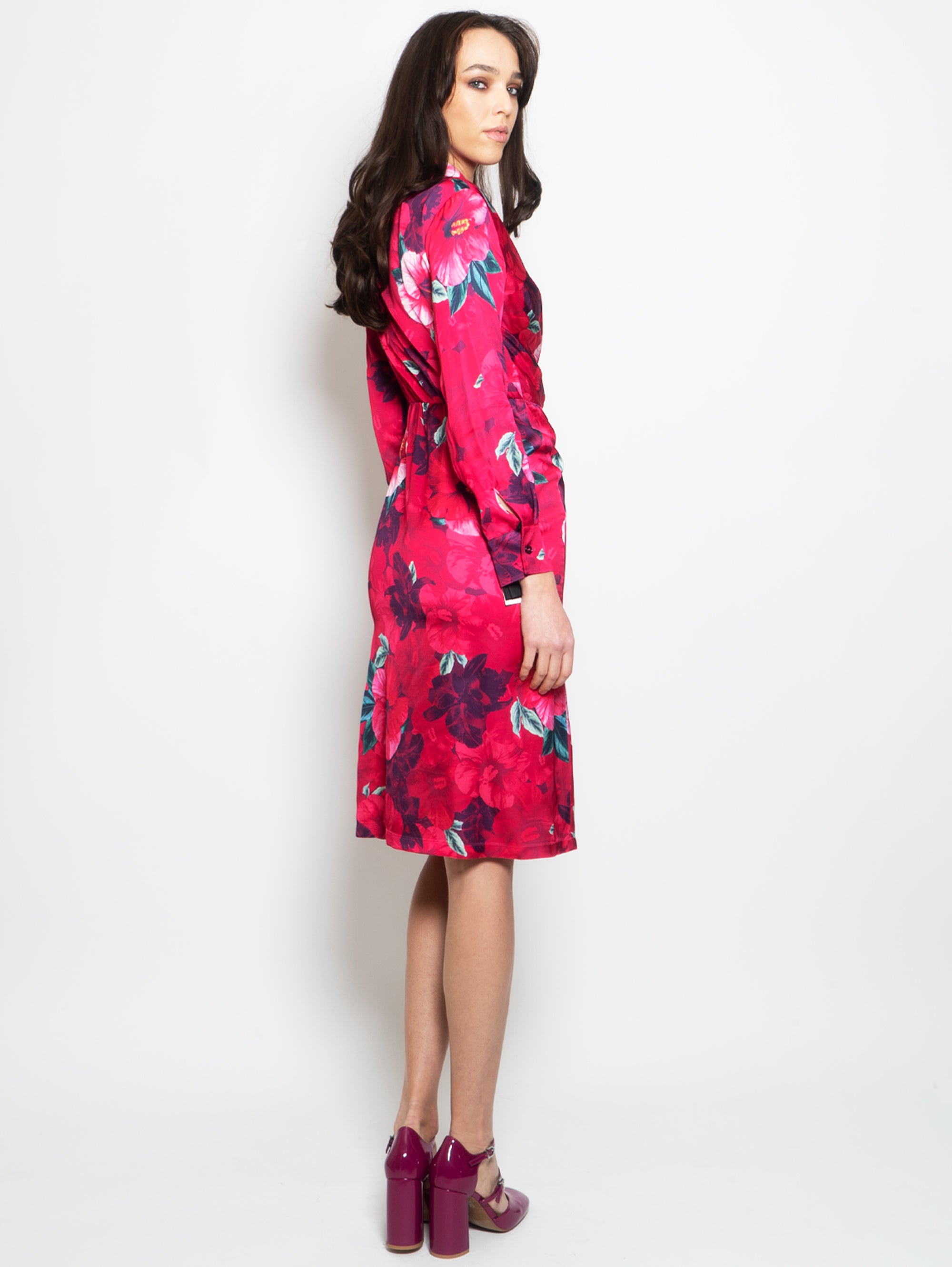- Abito lungo stile camicia in viscosa satin con stampa Ibisco
