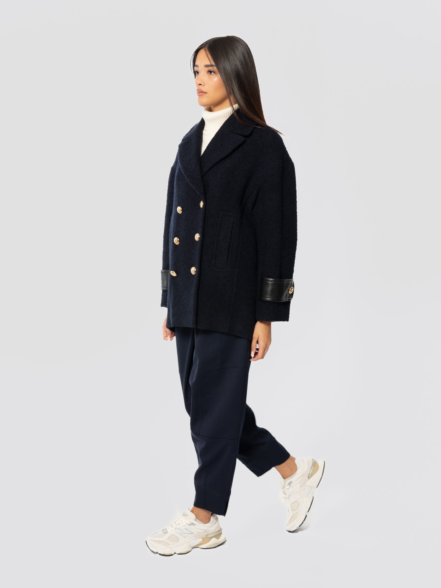 - Il tessuto utilizzato in lana poly caratterizzato da un cambio di tessitura e di luce a sottolineare il disegno del materiale