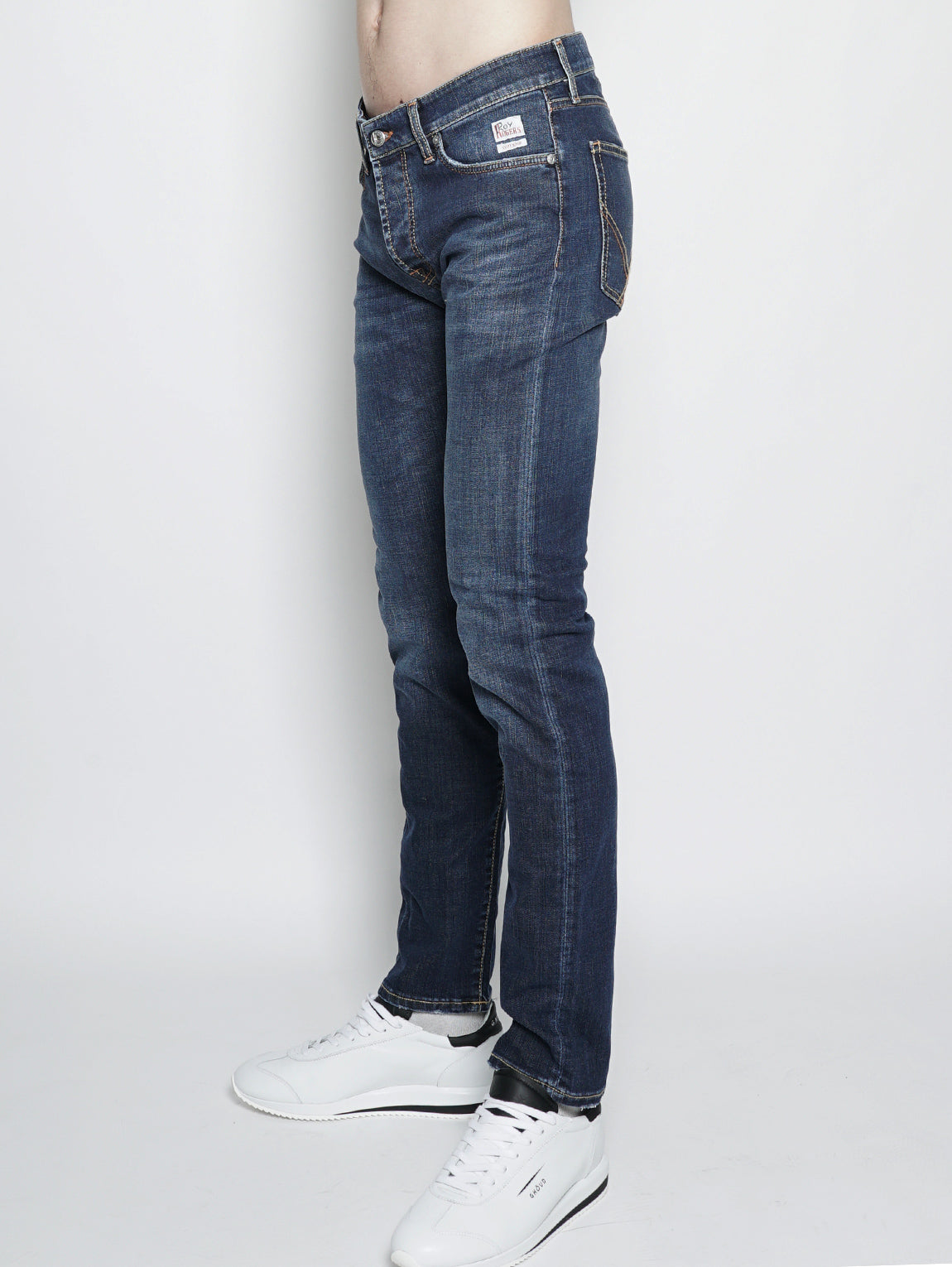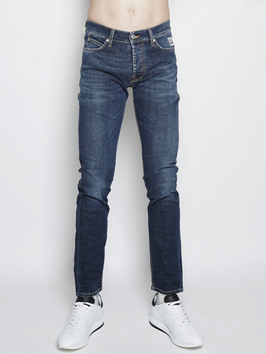 Jeans da uomo di Roy Rogers modello 529 Superior Denim Paulo Denim di manifattura italiana, in denim elasticizzato. Dotato di allacciatura con bottoni, cinque tasche. Vita media, slim fit con fondo stretto.