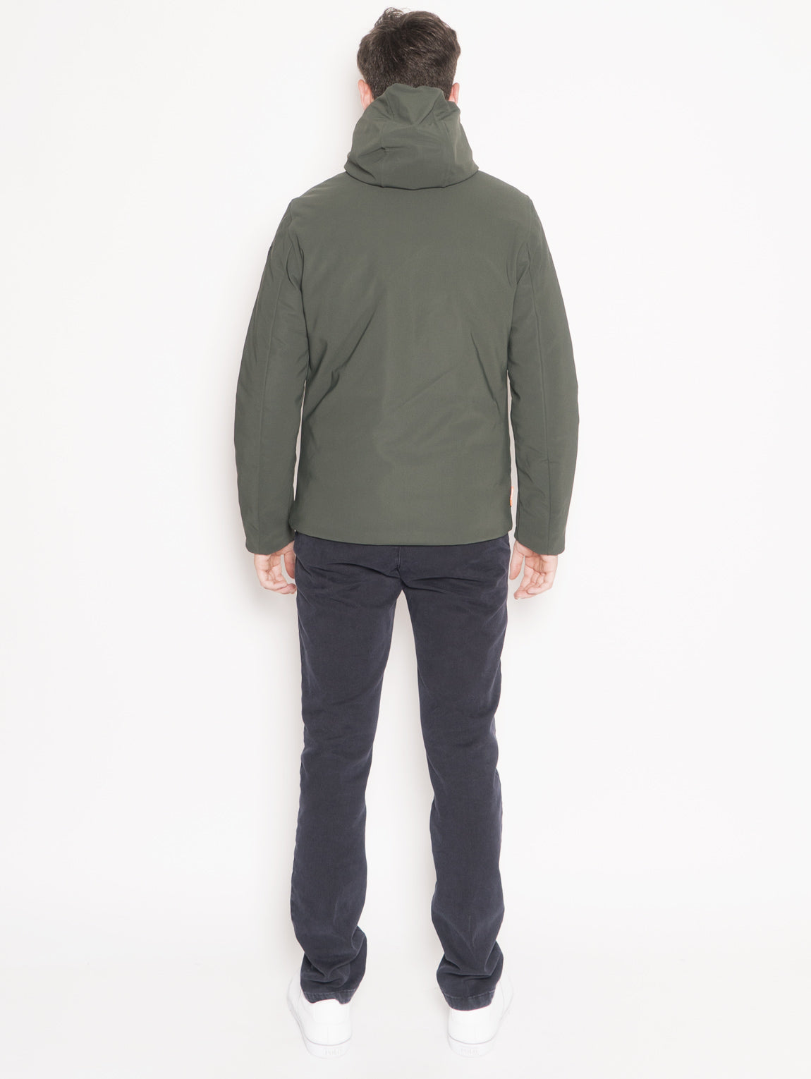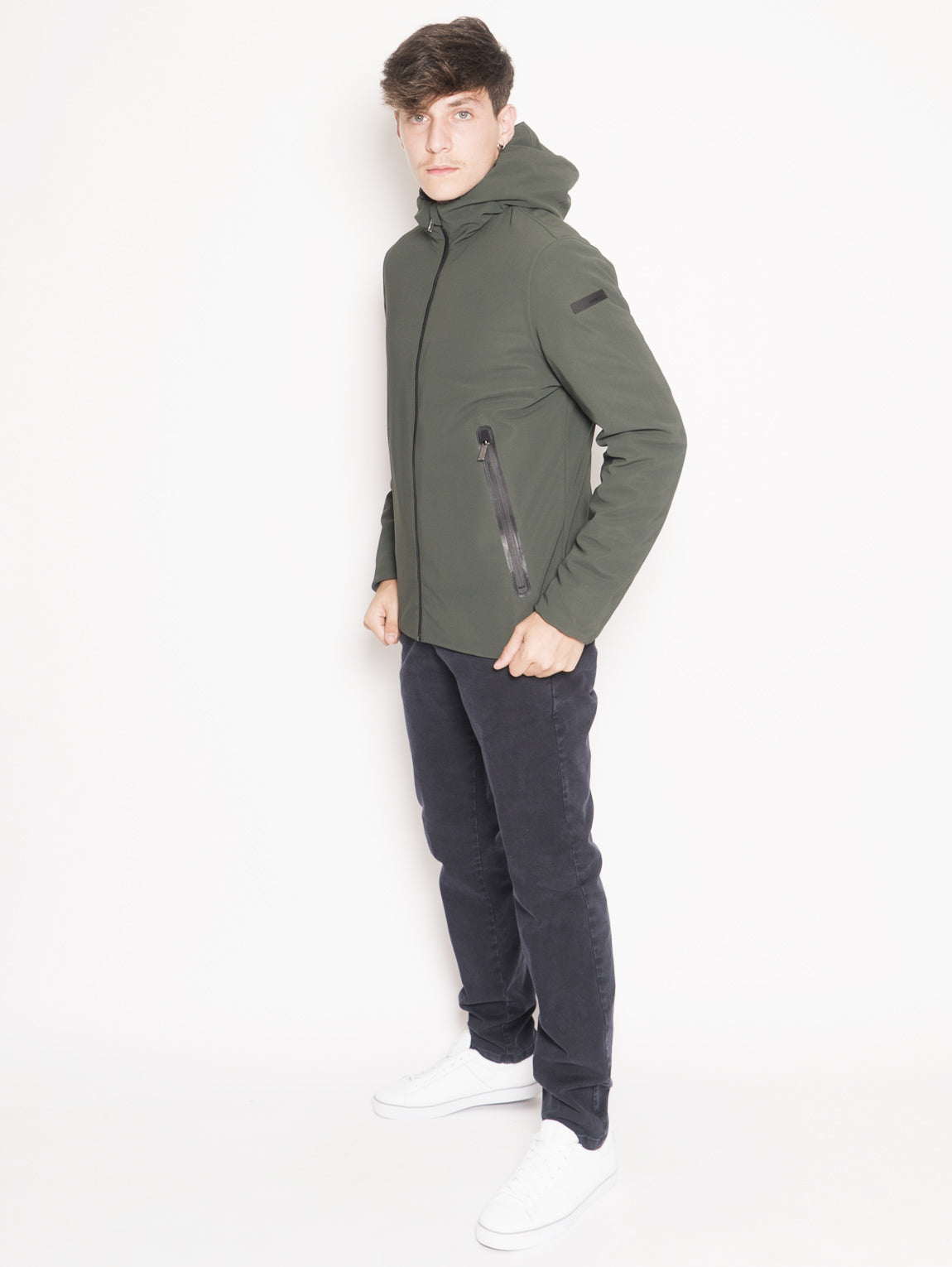 Giubbino corto con cappuccio da uomo winter storm W19001 di Rrd. Imbottitura in piuma, chiusura con zip a doppio cursore nastrata, cappuccio fisso, due tasche a filo sul davanti chiuse da zip nastrata, una tasca interna con zip, cuciture nastrate, con logo RRD sulla manica sinistra. Capo in tessuto RRD “Holystic Tecnology 3” a tre componenti che, uniti insieme, ne costituiscono la struttura: lo shell in poliammide/lycra® super matt (165g/m2- 80% polyamide e 20% elastane) viene unito ad una membrana poliuretanica elastica, traspirante, anti acqua e anti vento capace di assicurare una resistenza di 5.000 mm di colonna d’acqua.