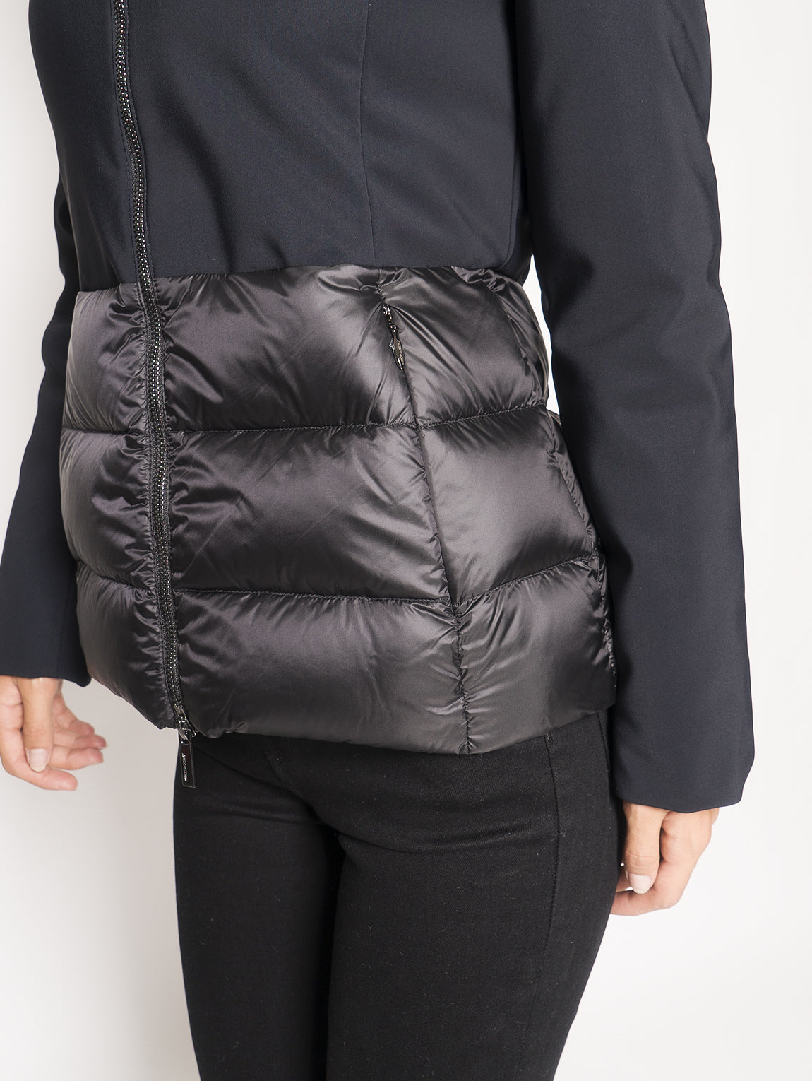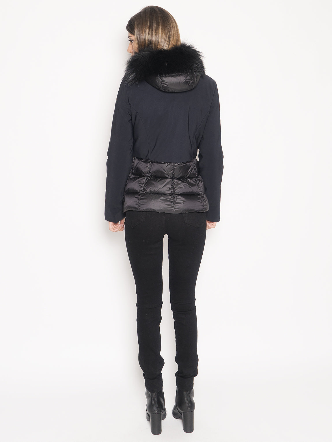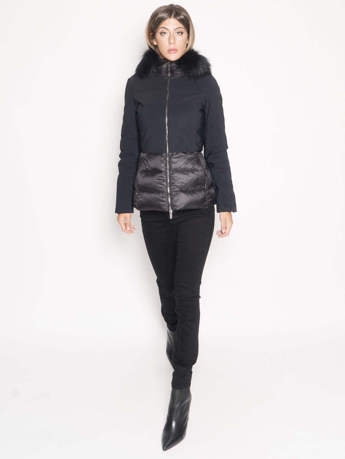 Piumino in doppio tessuto da donna winter hibrid hood w19532ft di Rrd. Capo dall'aspetto elegante in tessuto opaco elasticizzato e nylon lucido trapuntato. Vestibilità slim, imbottitura in piuma, impermeabile, bordatura del cappuccio è in vera pelliccia, chiusura con zip. Capo in tessuto RRD “Holystic Tecnology 3” a tre componenti che, uniti insieme, ne costituiscono la struttura: lo shell in poliammide/lycra® super matt (165g/m2- 80% polyamide e 20% elastane) viene unito ad una membrana poliuretanica elastica, traspirante, anti acqua e anti vento capace di assicurare una resistenza di 5.000 mm di colonna d’acqua.