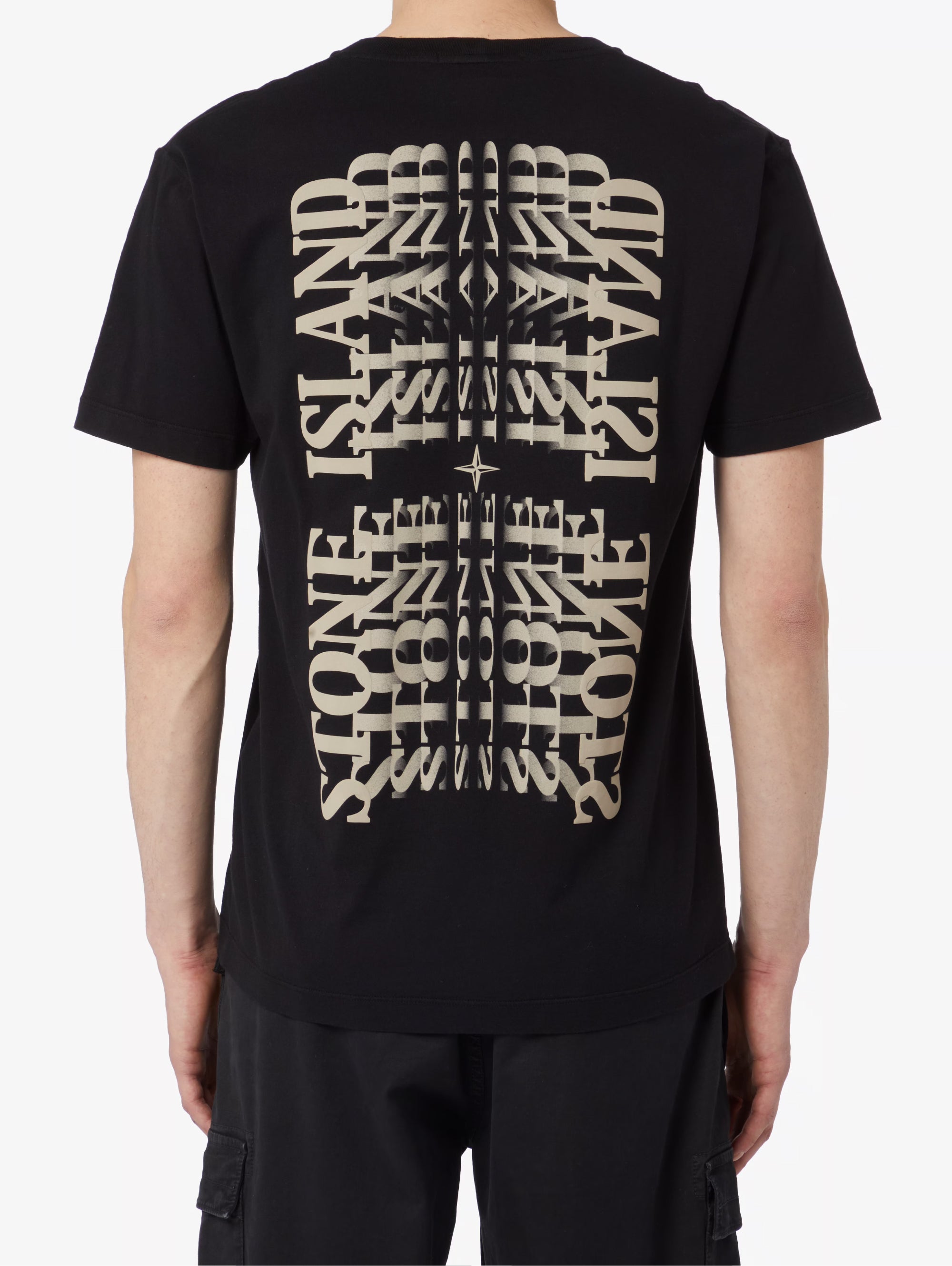 - Sulla schiena, grande motivo di stampa verticale a tecniche miste 'Lettering One' che gioca con il logo Stone Island